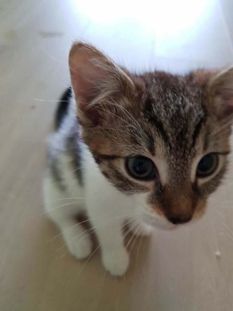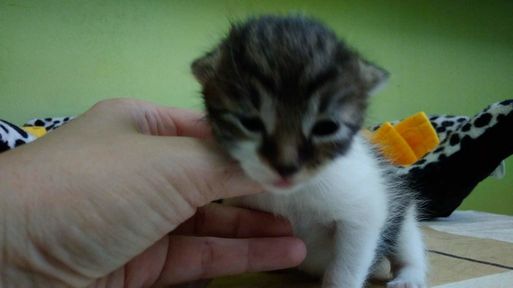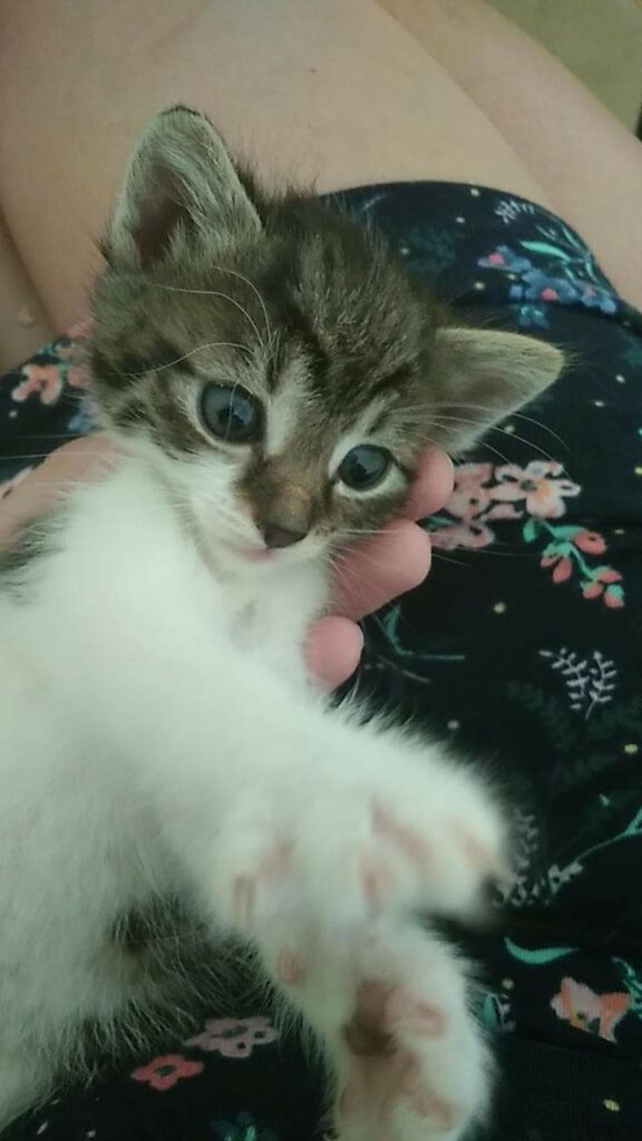 Kociaki trafiły do nas po dramatycznej interwencji mając zaledwie tydzień. Odebranych zostało 7 kotów, w tym część po przejściach. Ich mama, bura kotka była bez przedniej łapki, mimo to świetnie wychowała te dwa słodziaki.