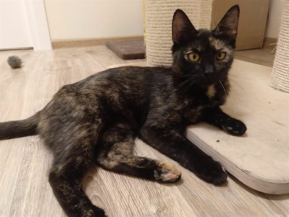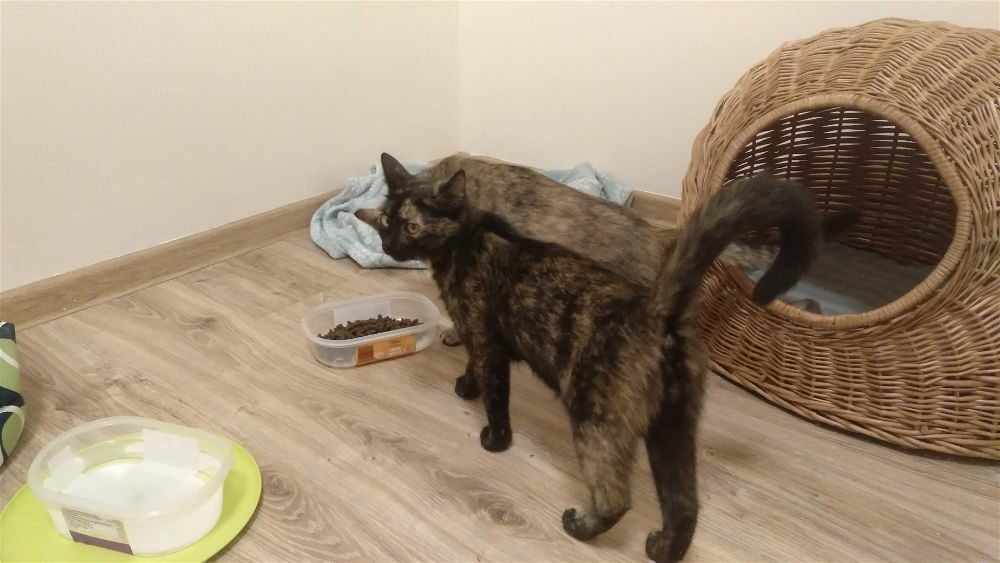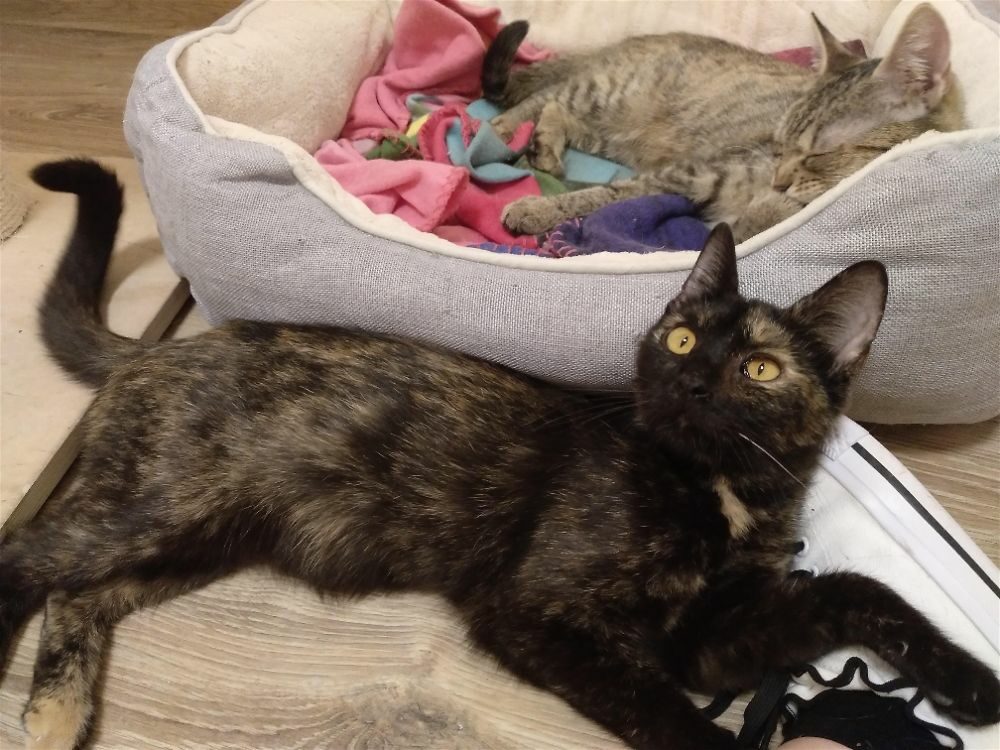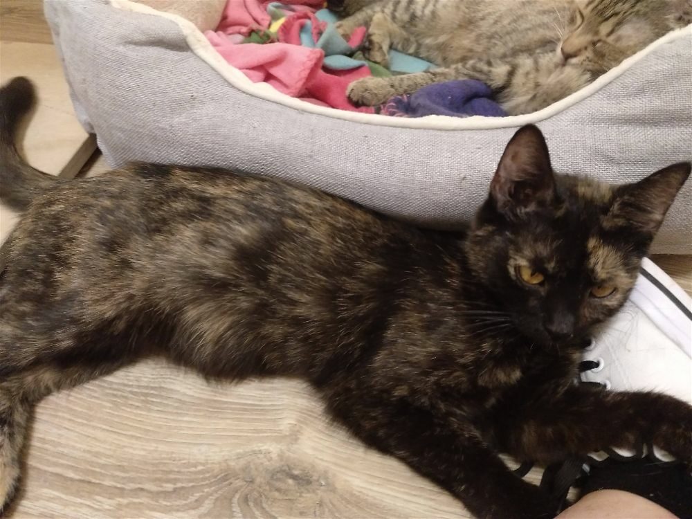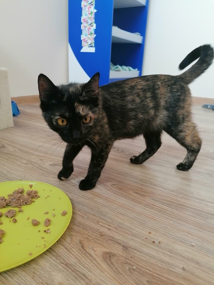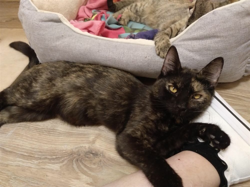 Z maluchami codziennie jesteśmy w lecznicy. Dorosłe kotki cierpią na infekcje oczu, uszu, a jedna z nich niepokoi nas ze względu na przyspieszony oddech i dziwne bólowe odruchy. Łącznie mamy z tamtego miejsca trzy kotki i pięć kociąt. Riona, z początku niespokojna, okazała się wyjątkowo miła i chętna do głaskania. Jest pełna energii i wdzięku.
