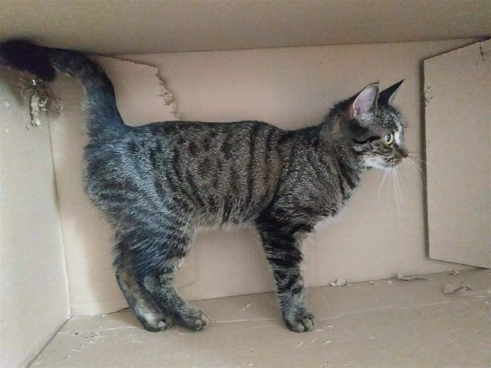 Kociak prosił o opiekę chodząc za ludźmi. Jest spokojny i ufny.