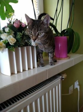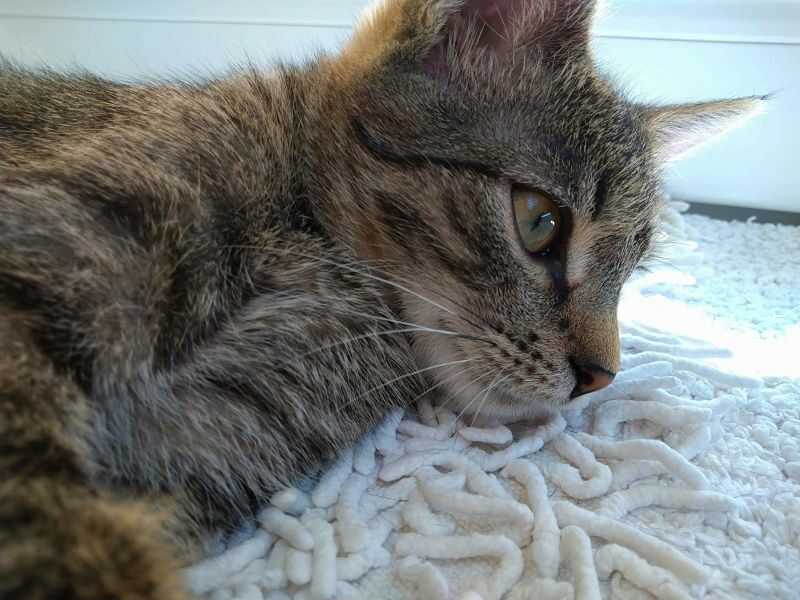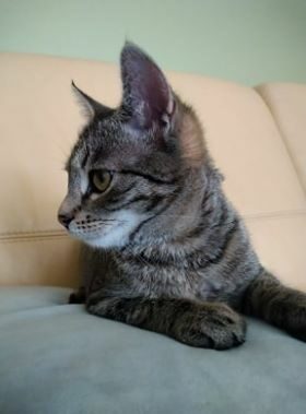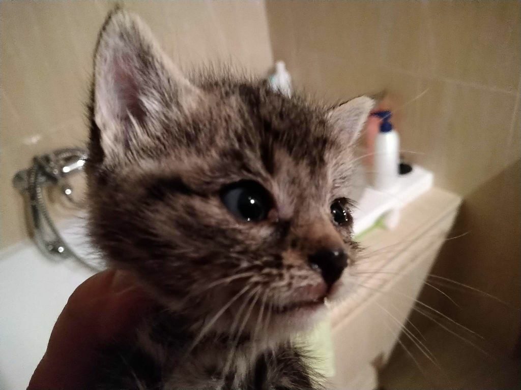 Została znaleziona w lesie, malutka z kocim katarem i chorym oczkiem. Niesamodzielna, nie umiejąca jeść z miski. Kiedy dorosła, okazało się że jest nosicielką wirusa FeLV, choć nie ma żadnych objawów i cieszy się bardzo dobrym zdrowiem.