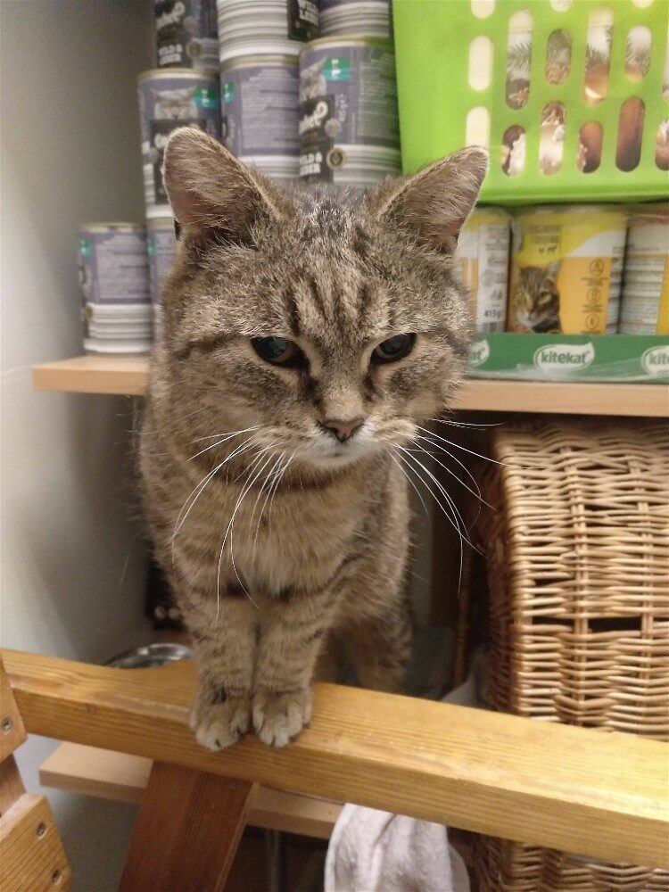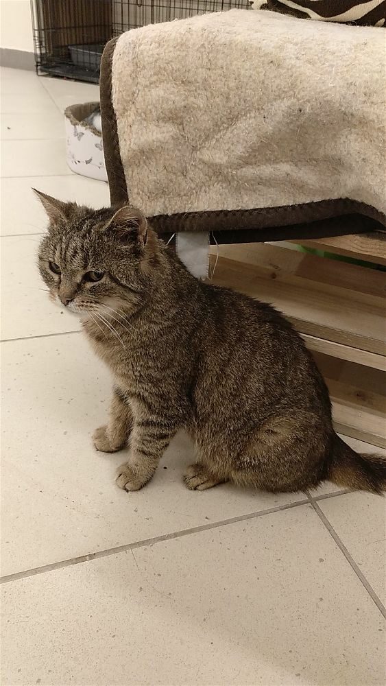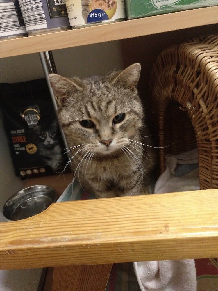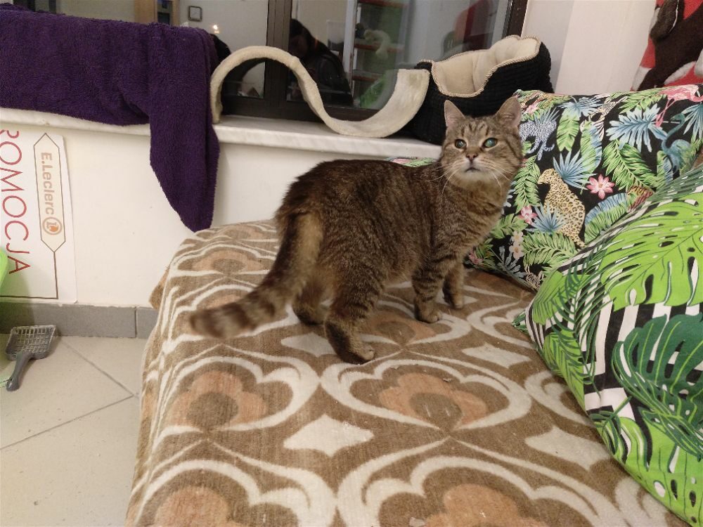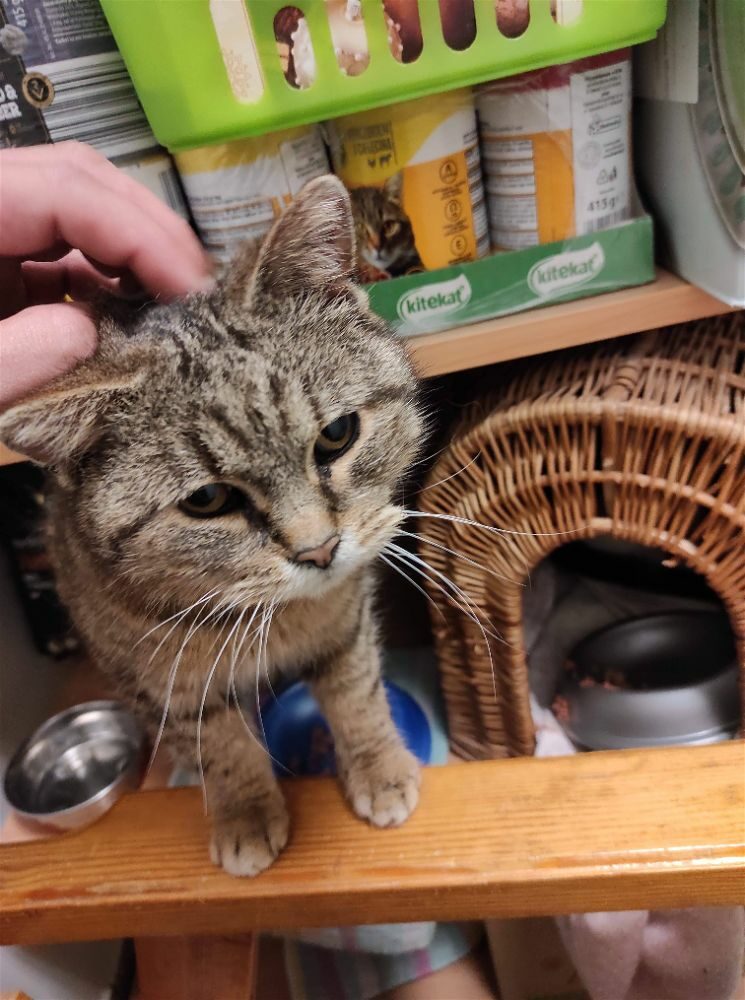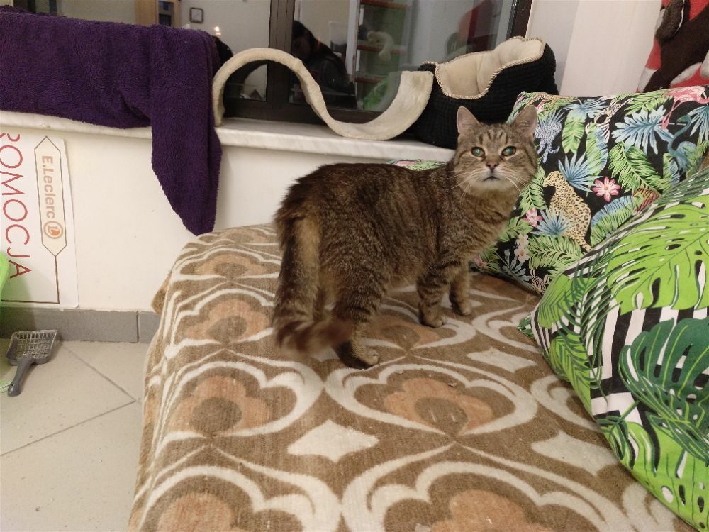 Przybyła z interwencji gdzie mieszkała w klatce na króliki razem z piętnastoma innymi kotkami. Jest bardzo spokojna, z początku wystraszona, ale głaskana pomału wychodzi z ukrycia i pięknie mruczy. Jak na niewidomego kota jest całkiem odważna.