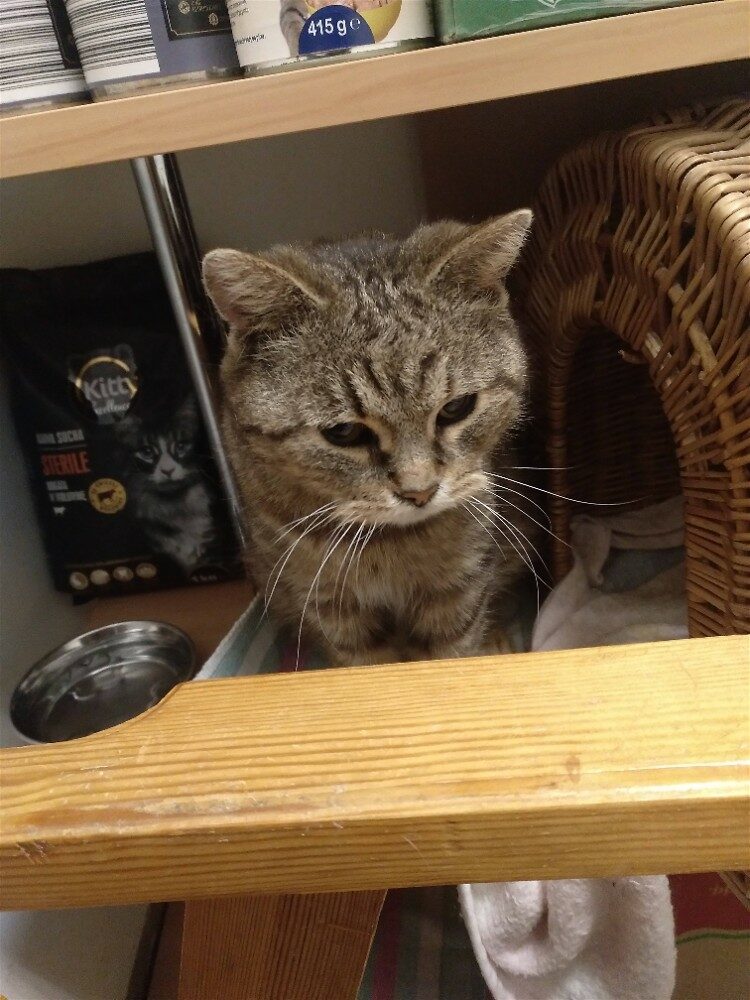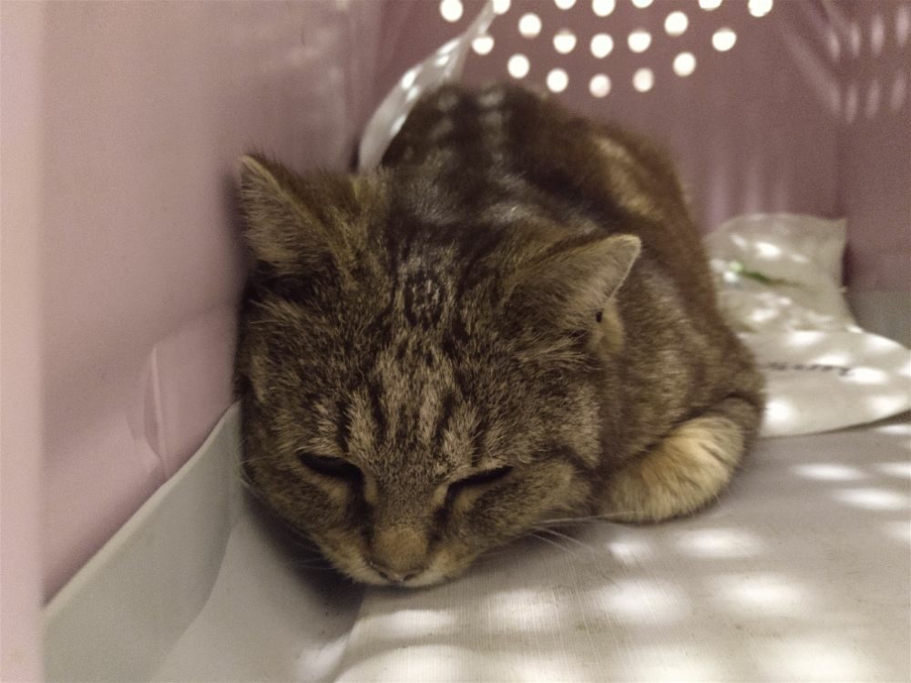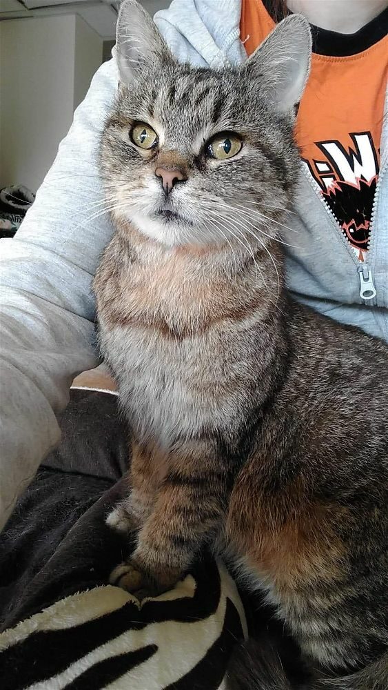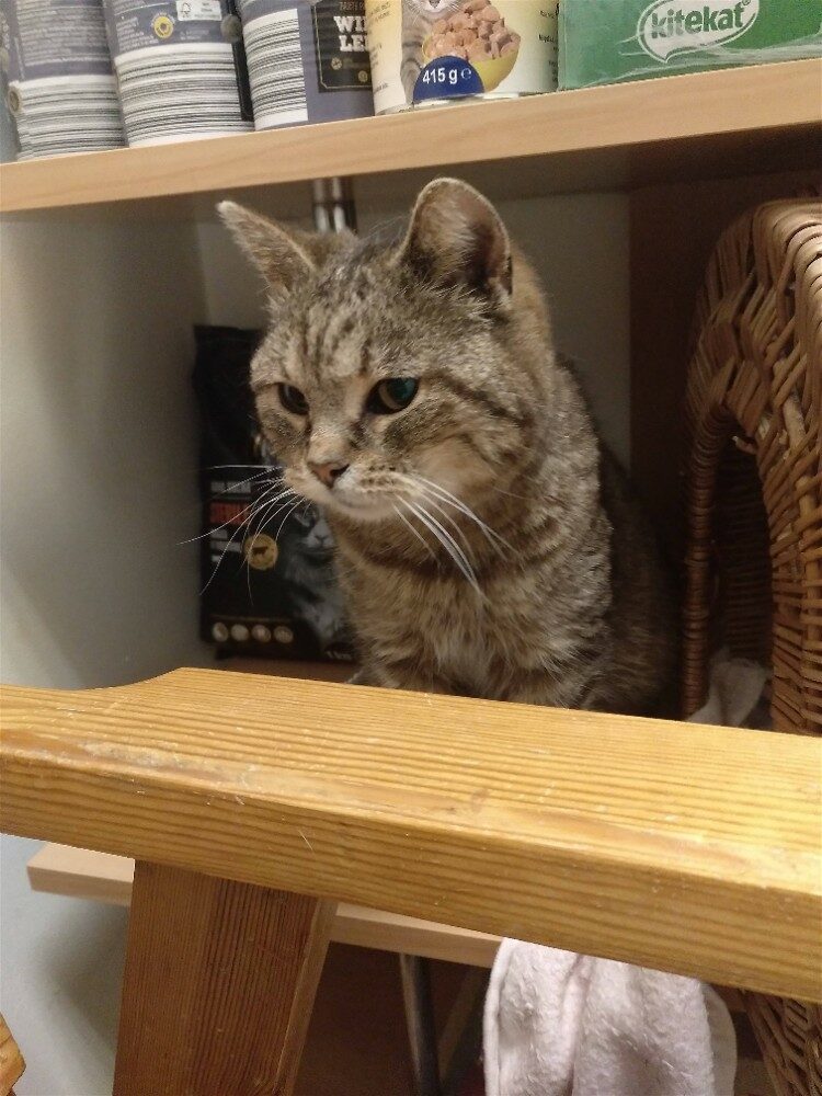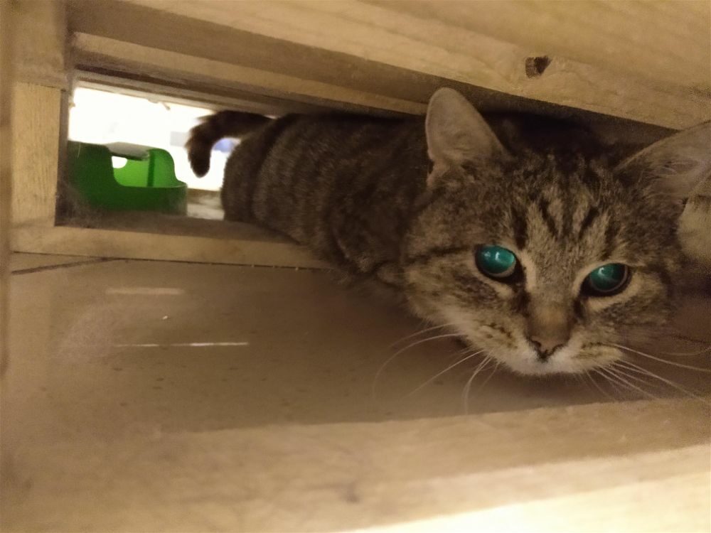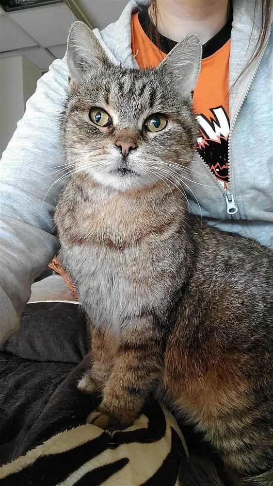 Przybyła z interwencji gdzie mieszkała w klatce na króliki razem z piętnastoma innymi kotkami. Jest bardzo spokojna, z początku wystraszona, ale głaskana pomału wychodzi z ukrycia i pięknie mruczy. Jak na niewidomego kota jest całkiem odważna.