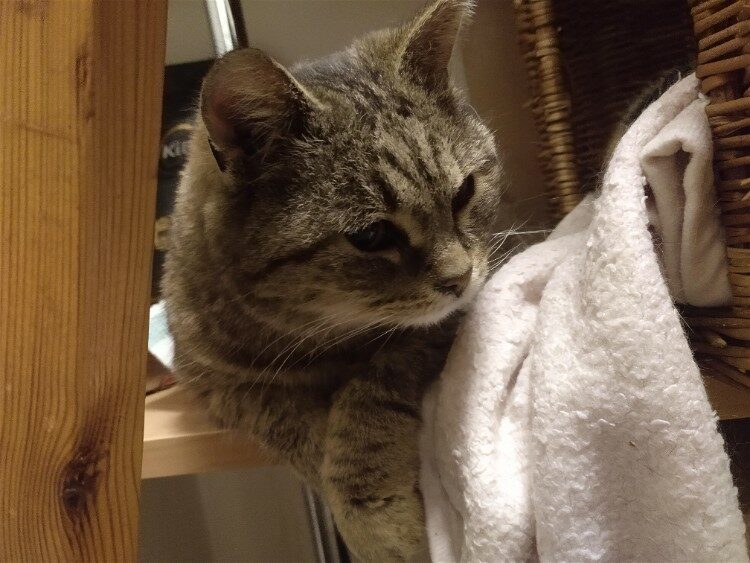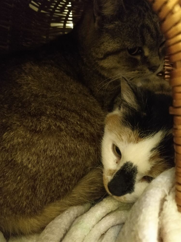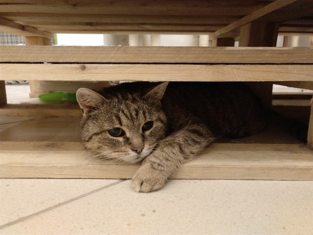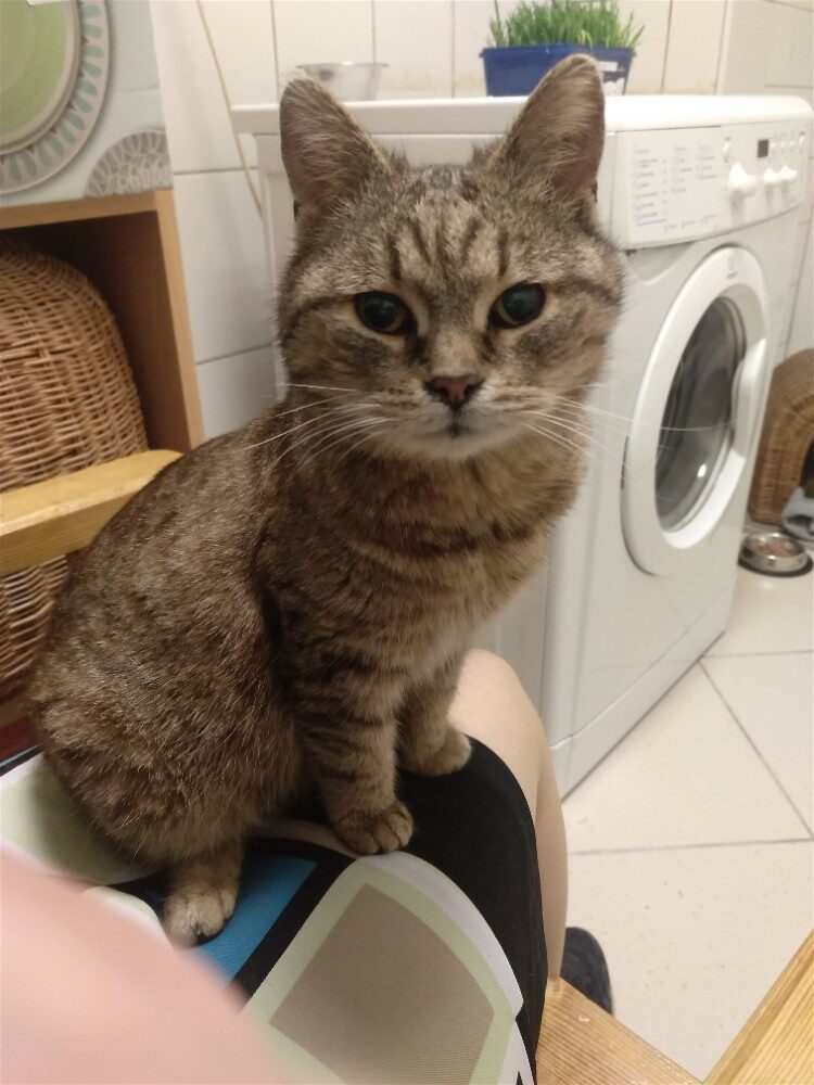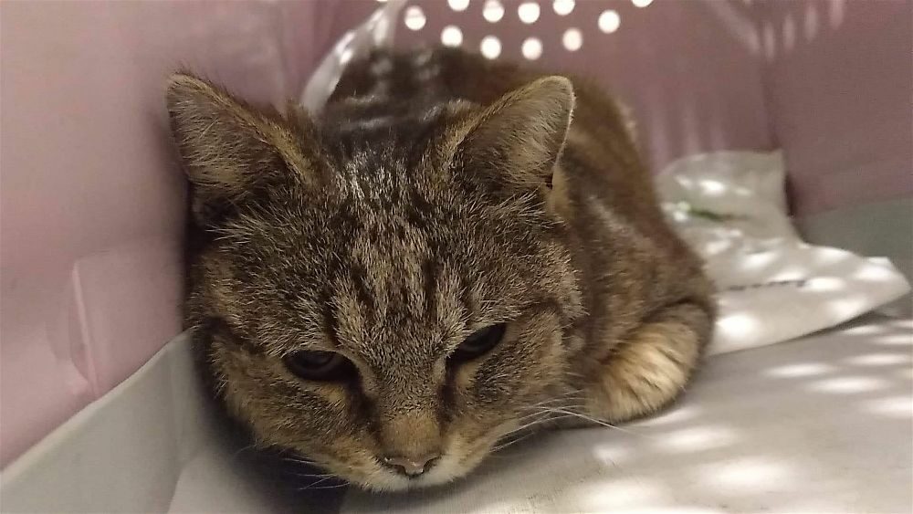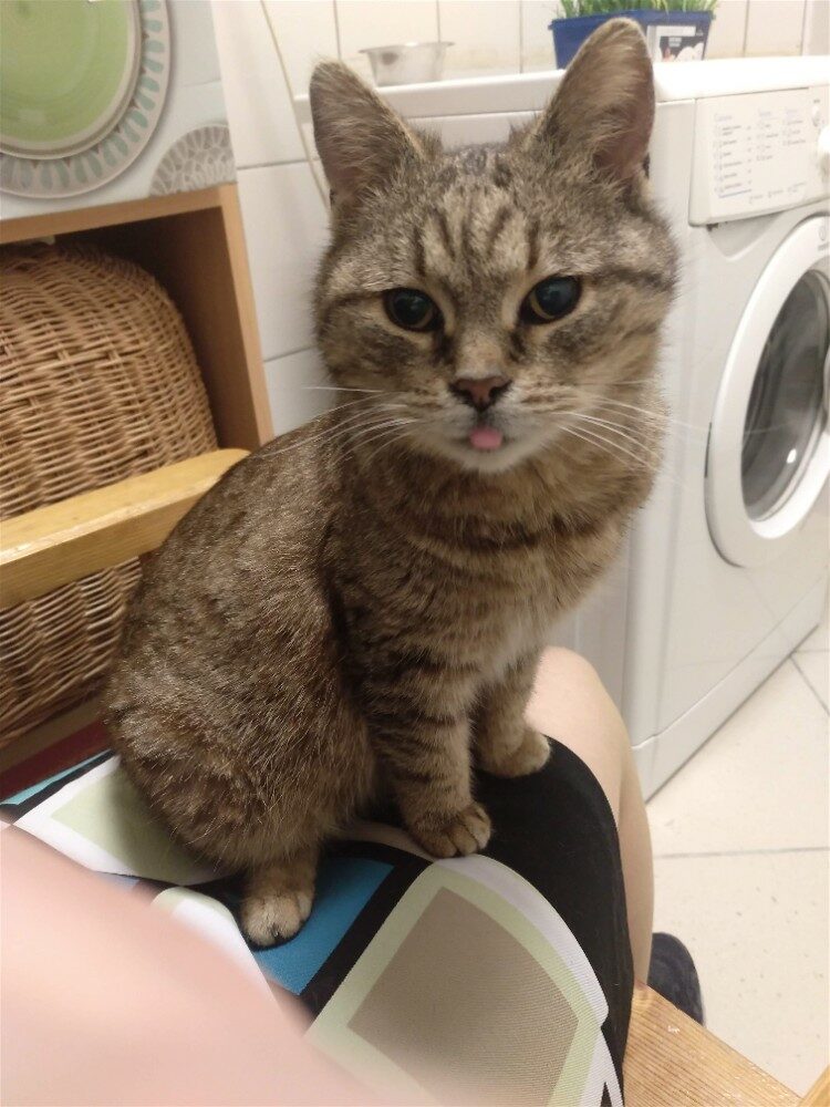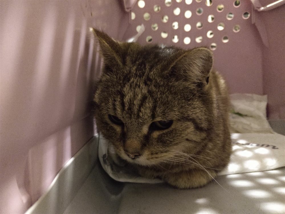 Przybyła z interwencji gdzie mieszkała w klatce na króliki razem z piętnastoma innymi kotkami. Jest bardzo spokojna, z początku wystraszona, ale głaskana pomału wychodzi z ukrycia i pięknie mruczy. Jak na niewidomego kota jest całkiem odważna.