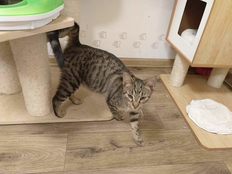 Pchełka to koteczka która przyjechała do nas z ostatnim transportem z Ukrainy. Prawdopodobnie urodziła się z wadą genetyczną, przez co ma nieco karzełkowatą budowę ciała i wykrzywione łapki.