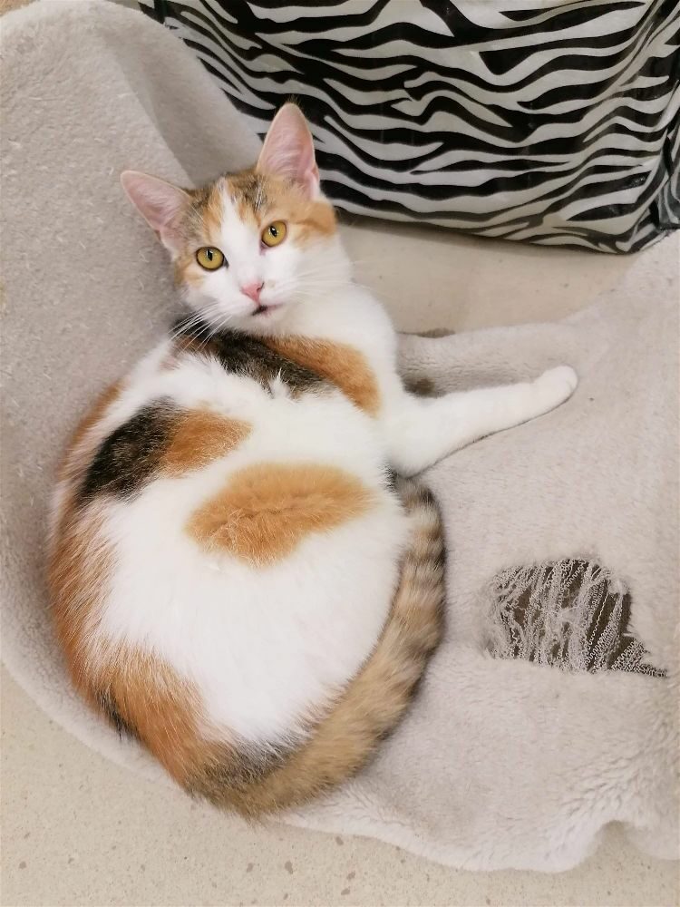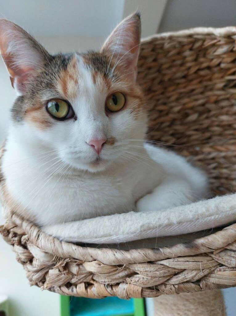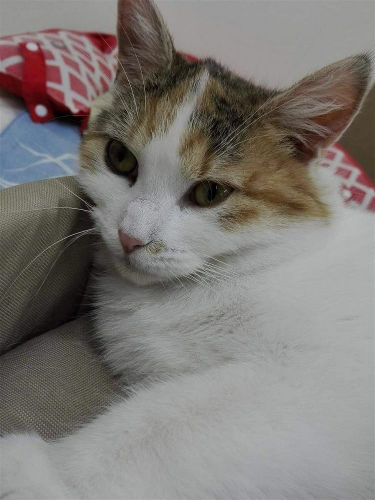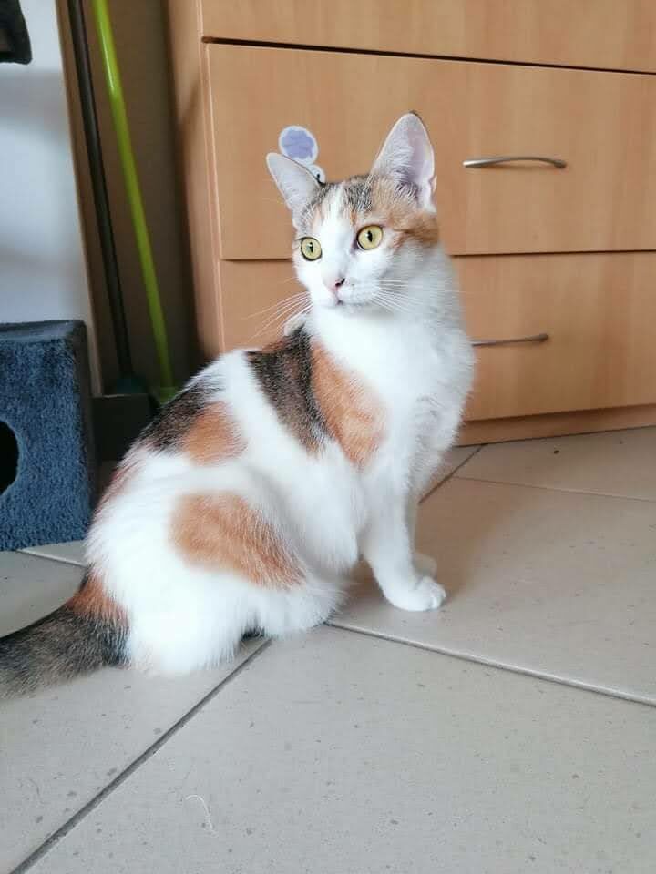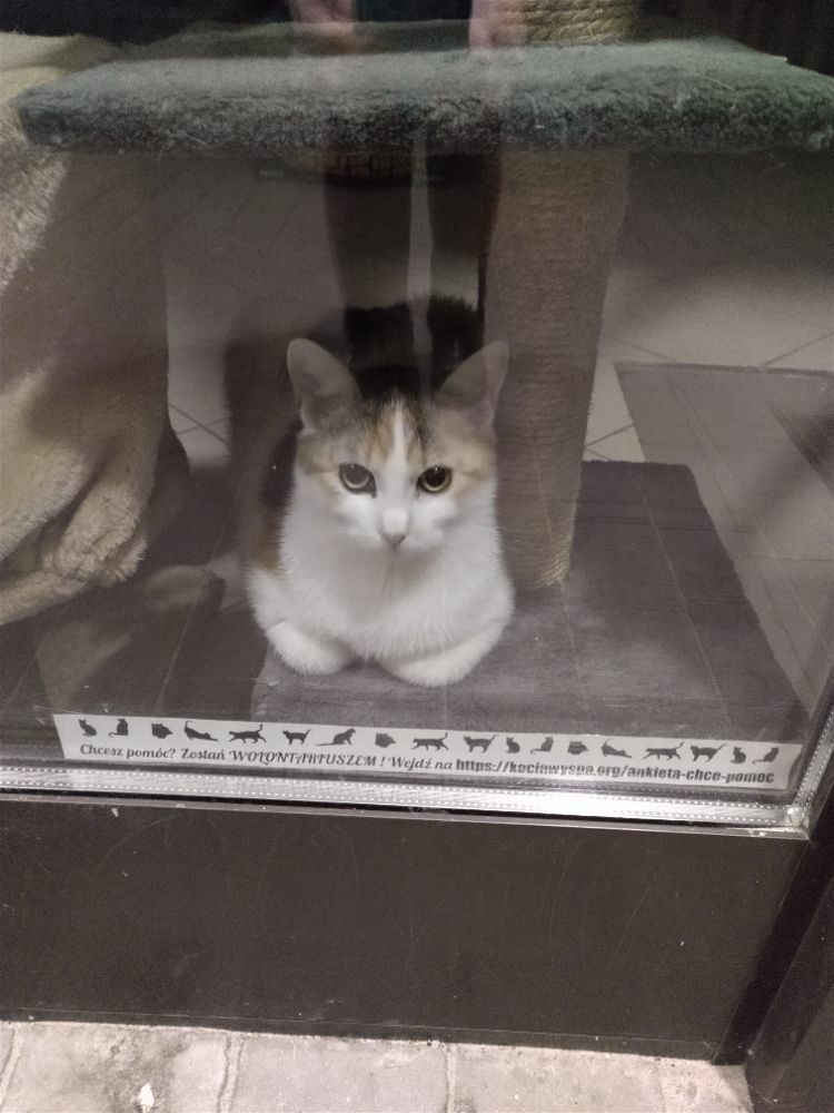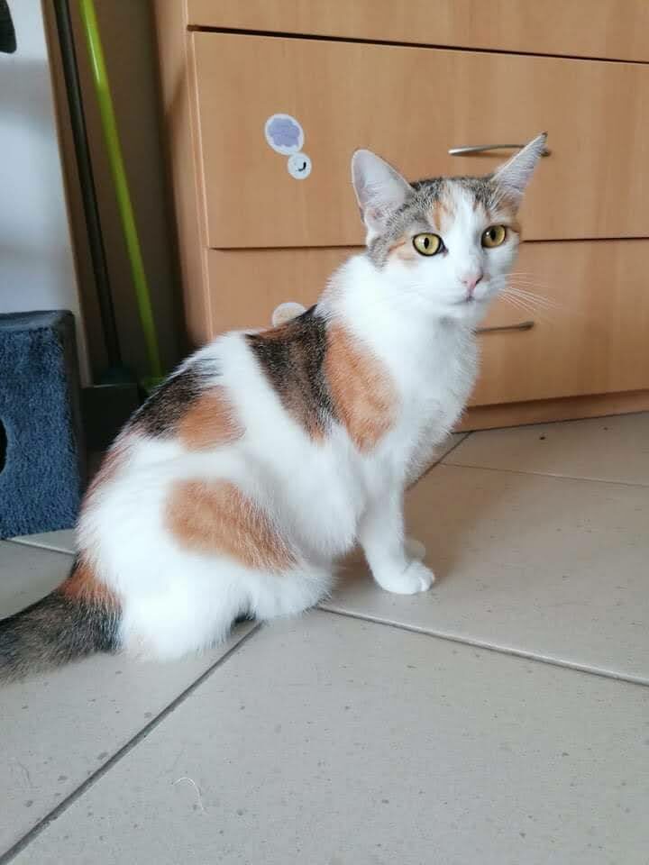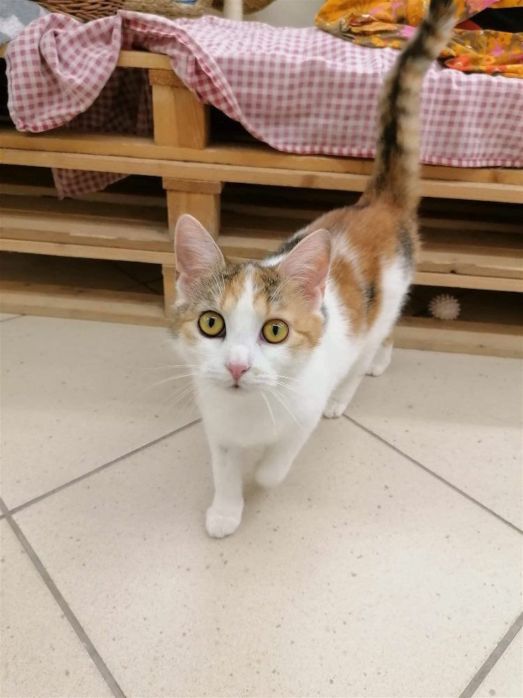 Kotka została znaleziona na czyjejś posesji wraz z trójką rodzeństwa, prawdopodobnie przyszły od kotki sąsiadów pozostawione samopas. Uwielbia głaskanie. mruczy, ugniata, przychodzi do człowieka po więcej, czasem jest bojaźliwa. Uwielbia ganiać za piłeczkami. Do oddania z kocim towarzystwem.