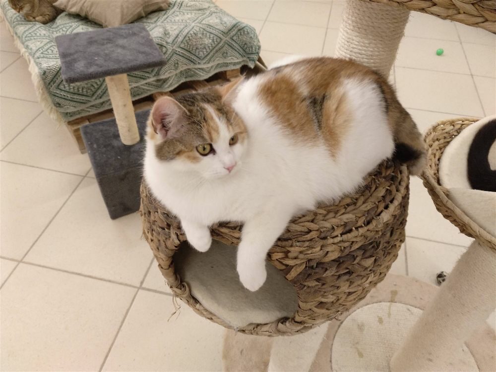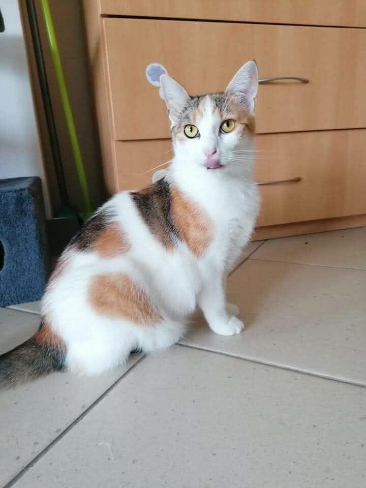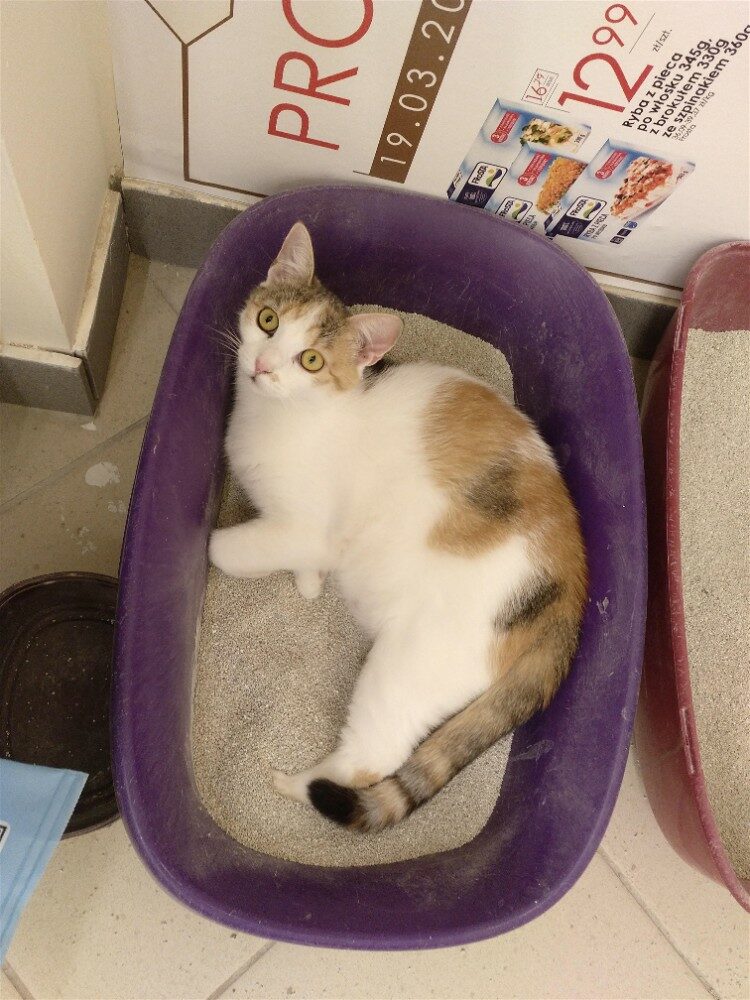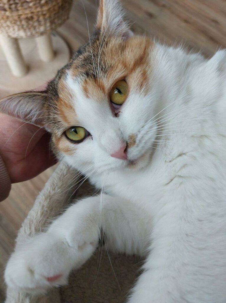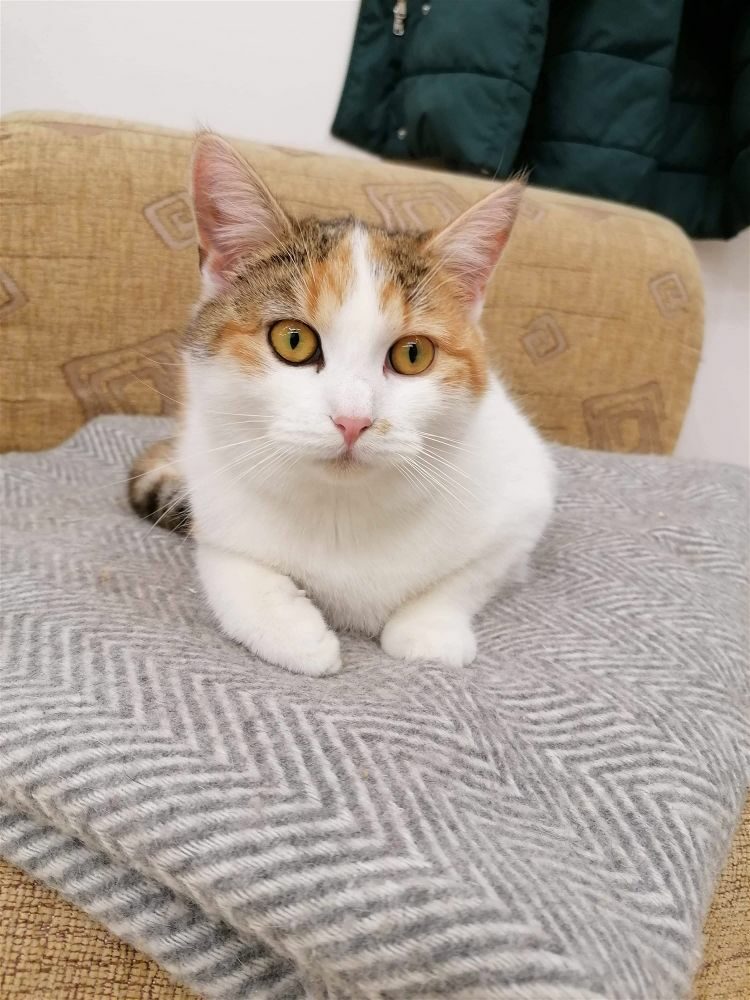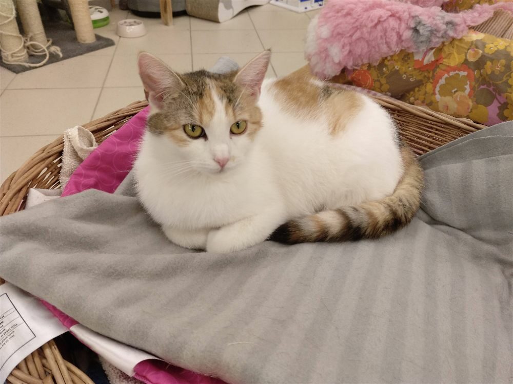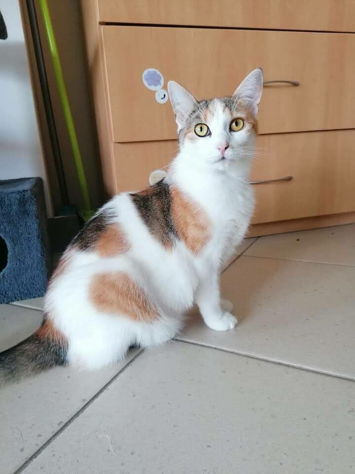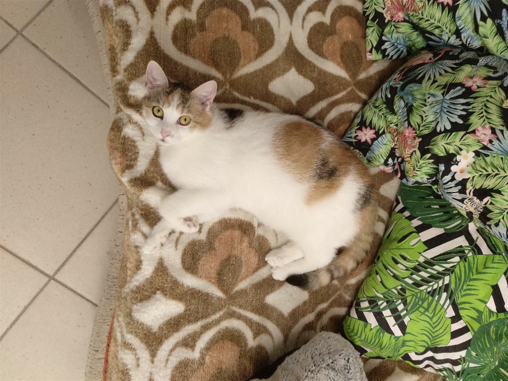 Kotka została znaleziona na czyjejś posesji wraz z trójką rodzeństwa, prawdopodobnie przyszły od kotki sąsiadów pozostawione samopas. Uwielbia głaskanie. mruczy, ugniata, przychodzi do człowieka po więcej, czasem jest bojaźliwa. Uwielbia ganiać za piłeczkami. Do oddania z kocim towarzystwem.
