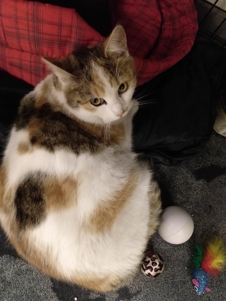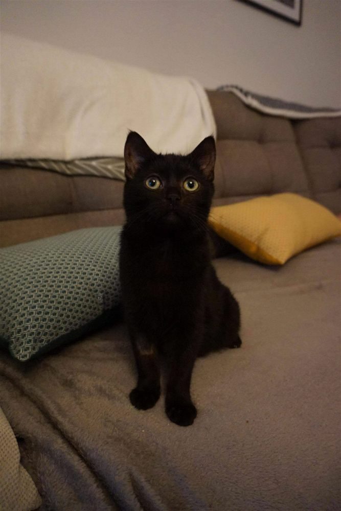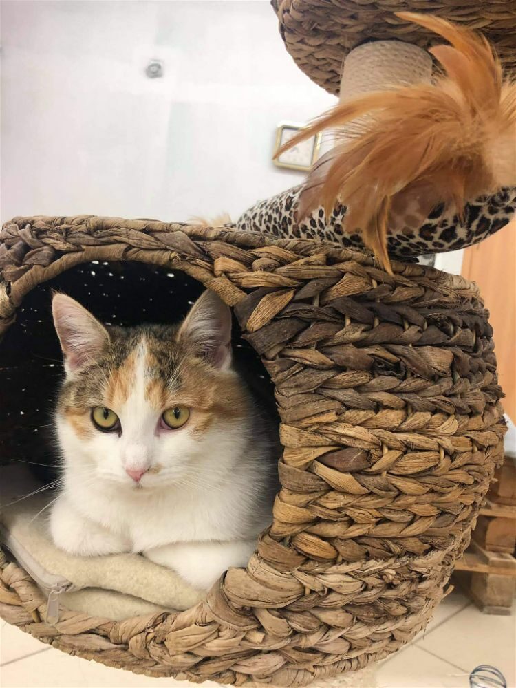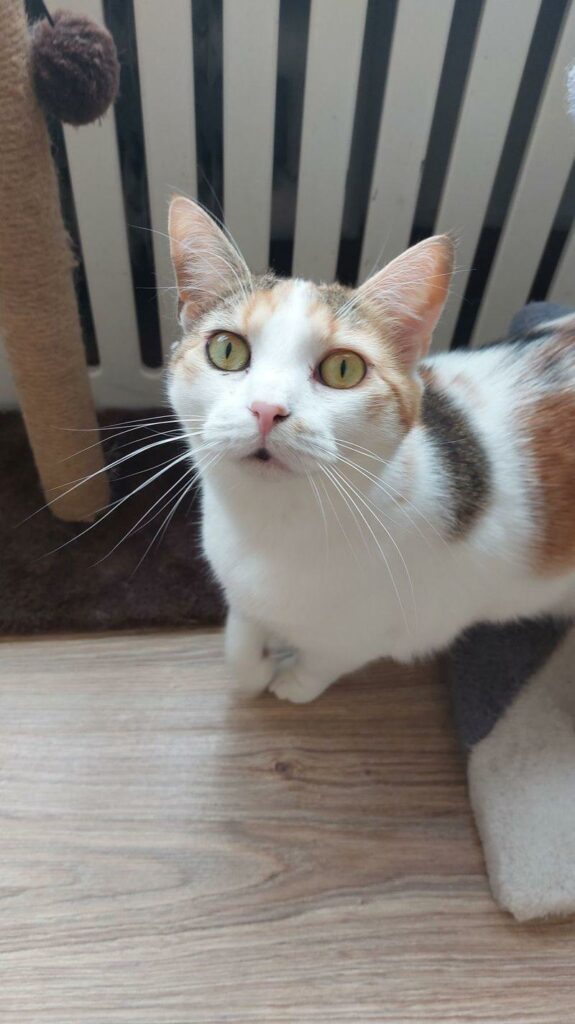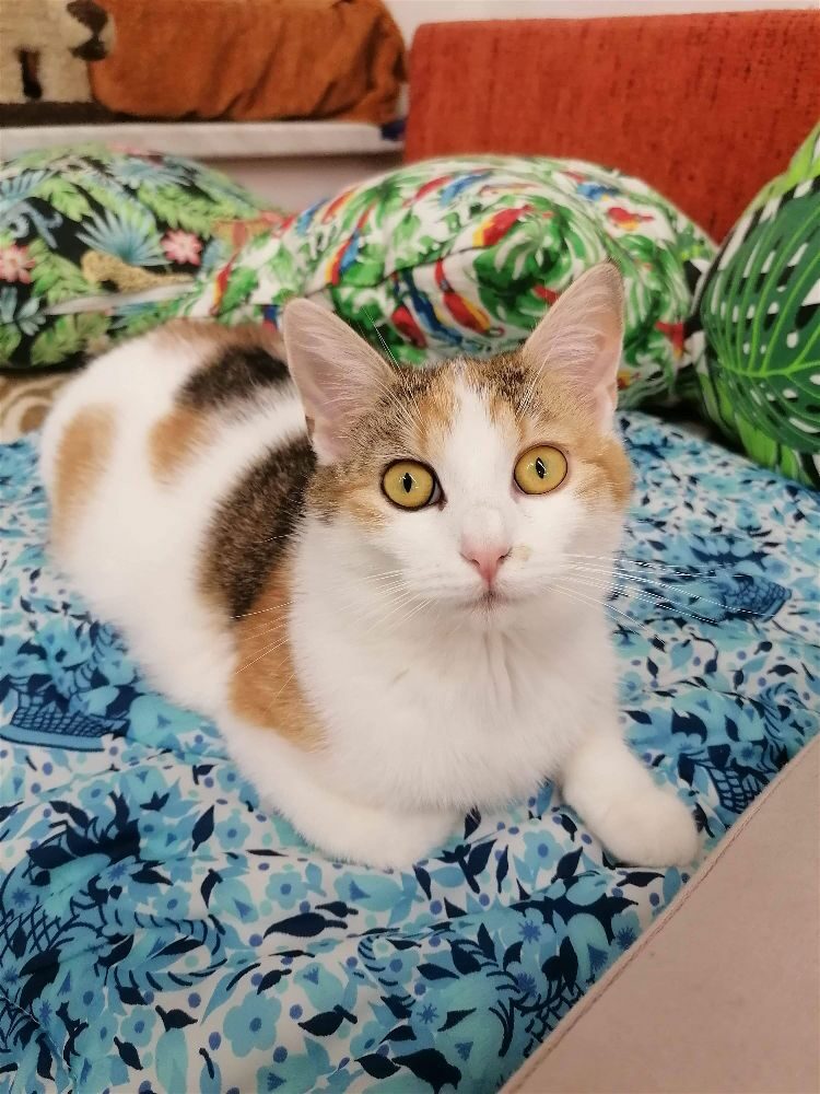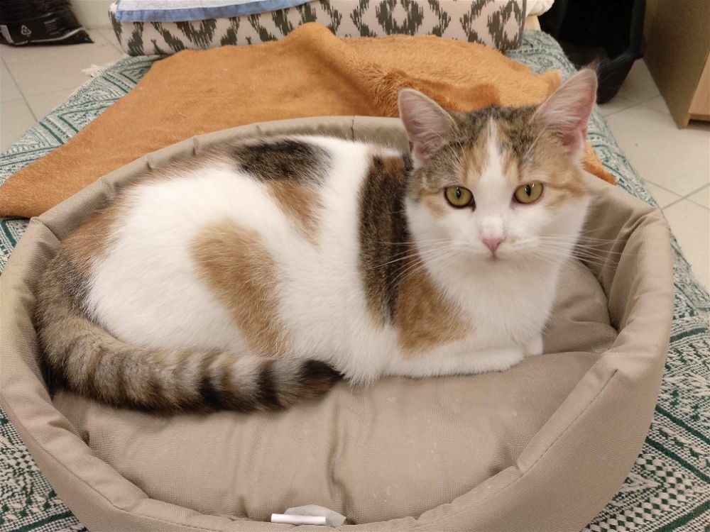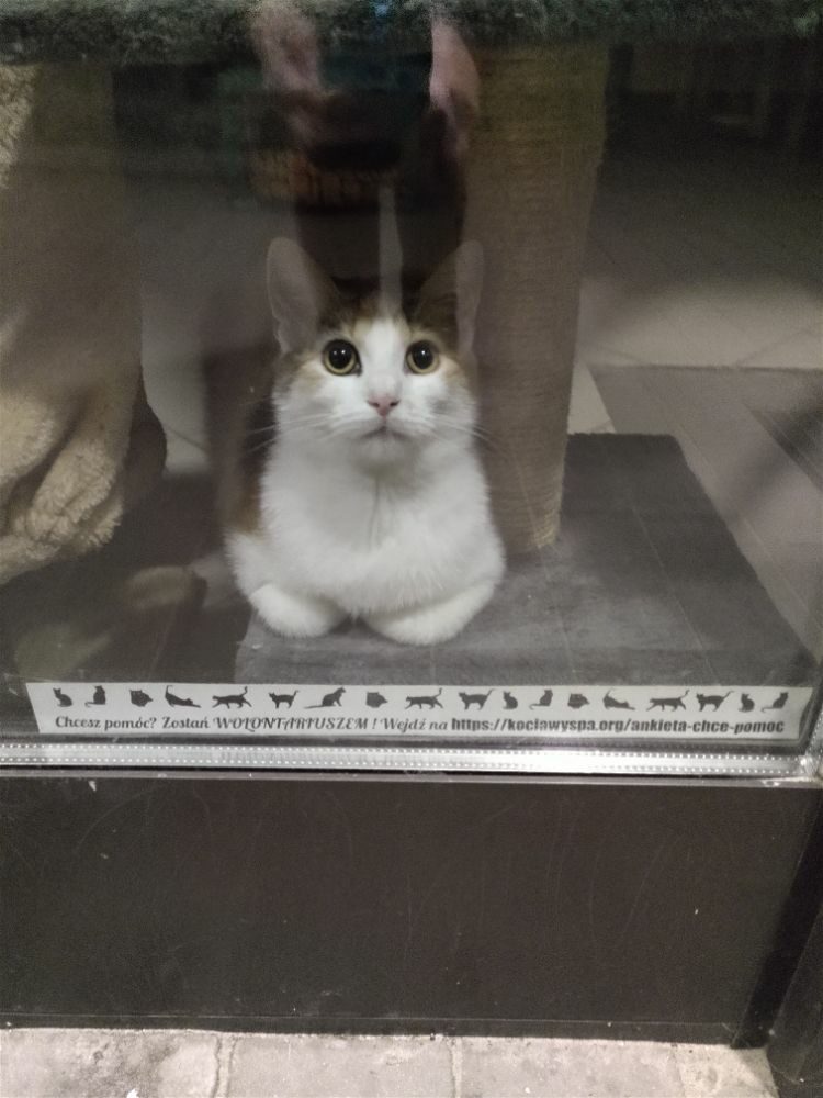 Kotka została znaleziona na czyjejś posesji wraz z trójką rodzeństwa, prawdopodobnie przyszły od kotki sąsiadów pozostawione samopas. Uwielbia głaskanie. mruczy, ugniata, przychodzi do człowieka po więcej, czasem jest bojaźliwa. Uwielbia ganiać za piłeczkami. Do oddania z kocim towarzystwem.