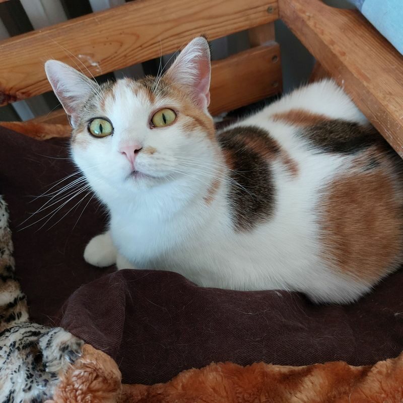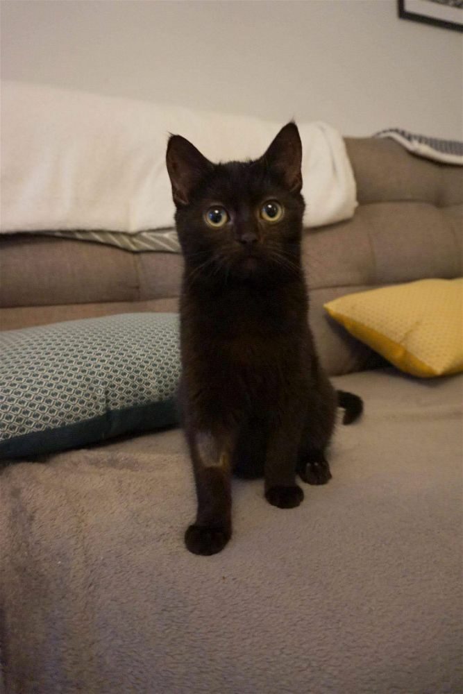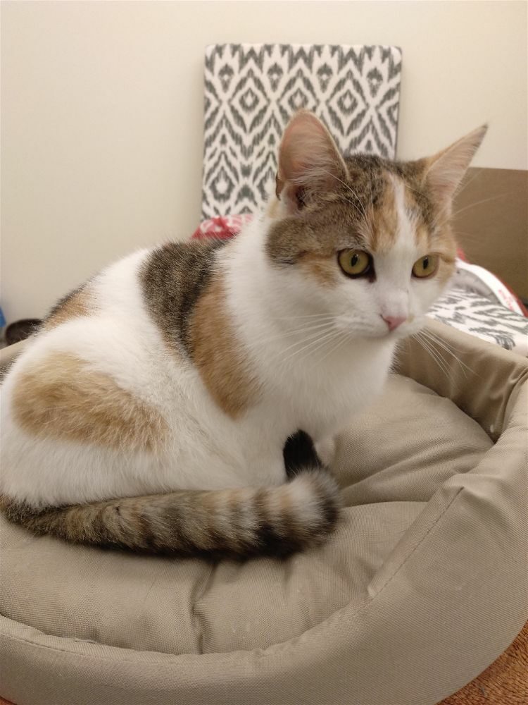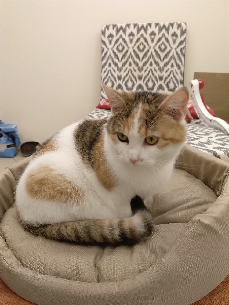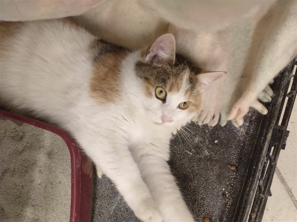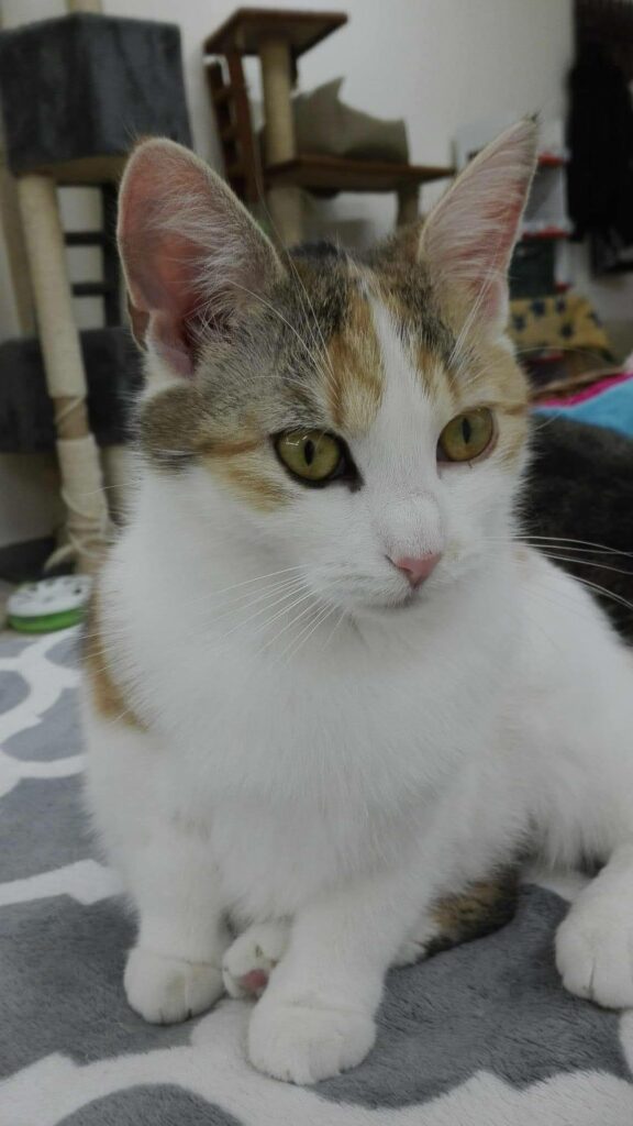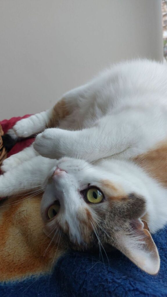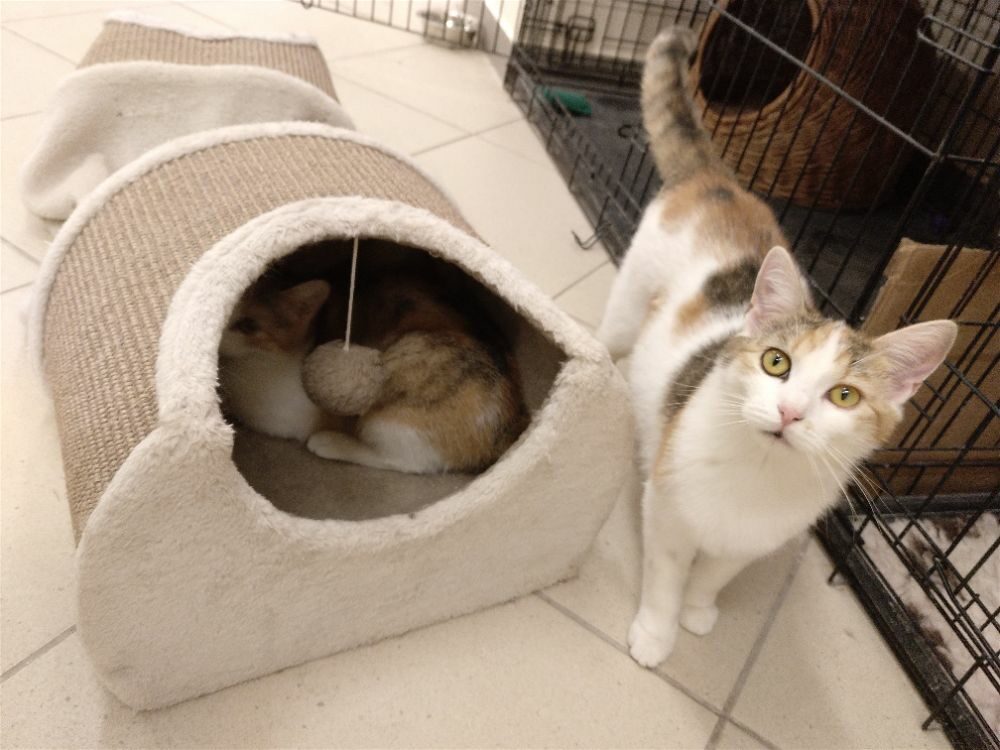 Kotka została znaleziona na czyjejś posesji wraz z trójką rodzeństwa, prawdopodobnie przyszły od kotki sąsiadów pozostawione samopas. Uwielbia głaskanie. mruczy, ugniata, przychodzi do człowieka po więcej, czasem jest bojaźliwa. Uwielbia ganiać za piłeczkami. Do oddania z kocim towarzystwem.