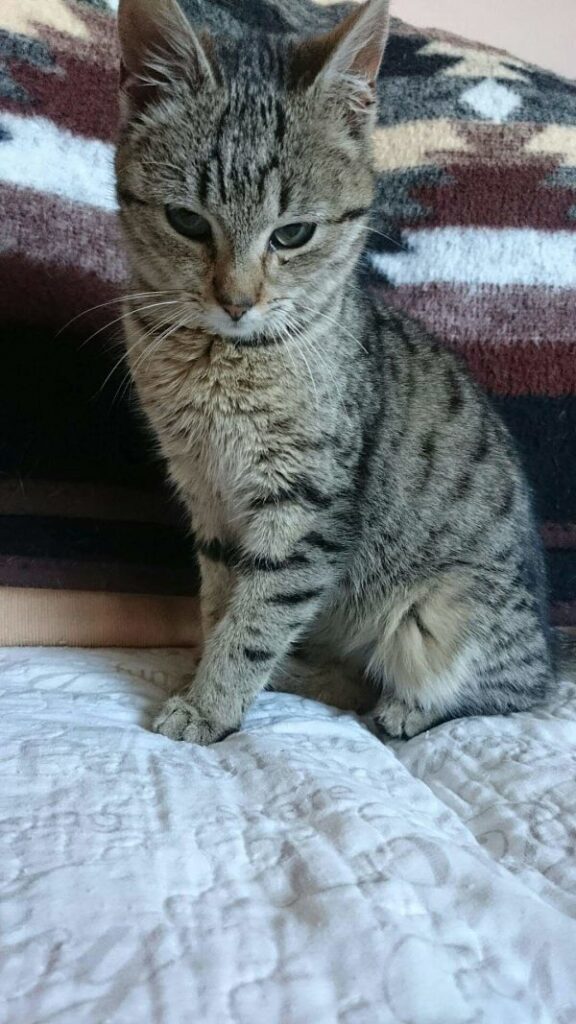 Podczas wypadu do lasu napotkaliśmy to maleństwo, które przyszło zwabione jedzeniem. Kotka się nie bała, wygląda na oswojoną. Podniesiona na ręce przyssała się w pierś szukając mleka.