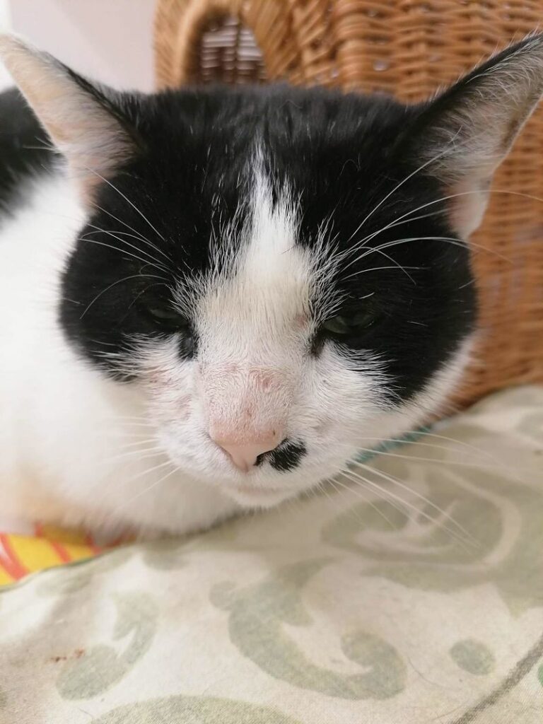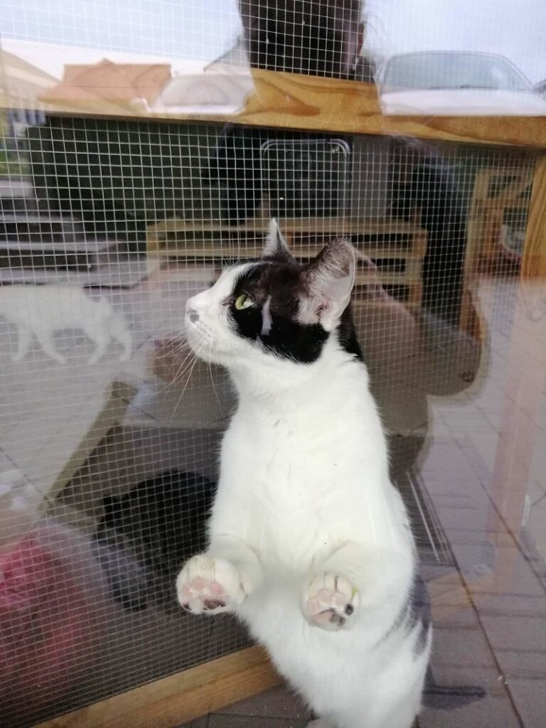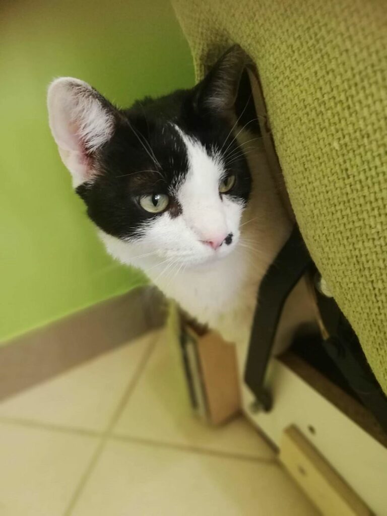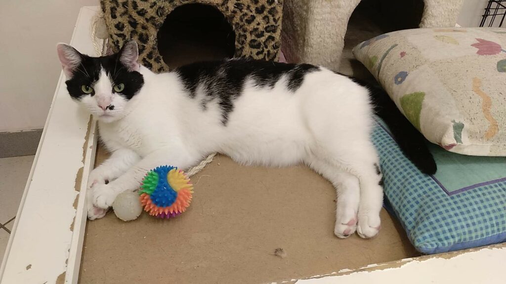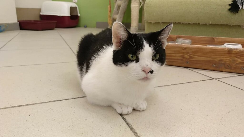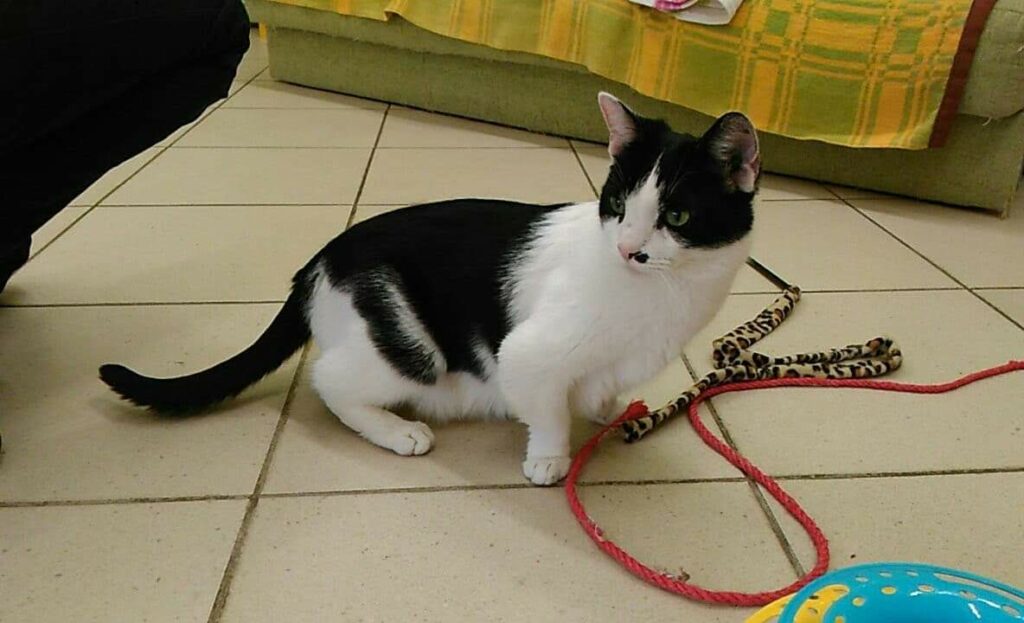 Niestety, jego opiekunka straciła mieszkanie, gdzie mogła mieszkać razem z kotem, a kocurek znów trafił do nas.
