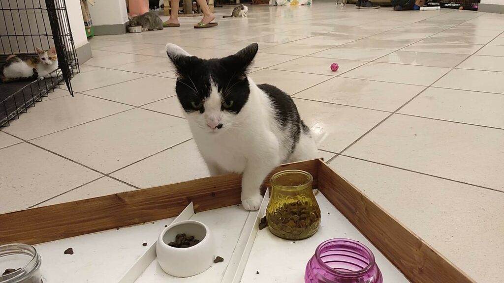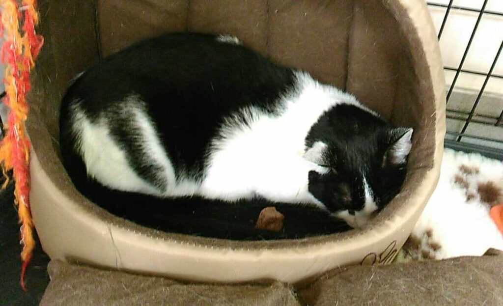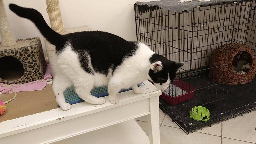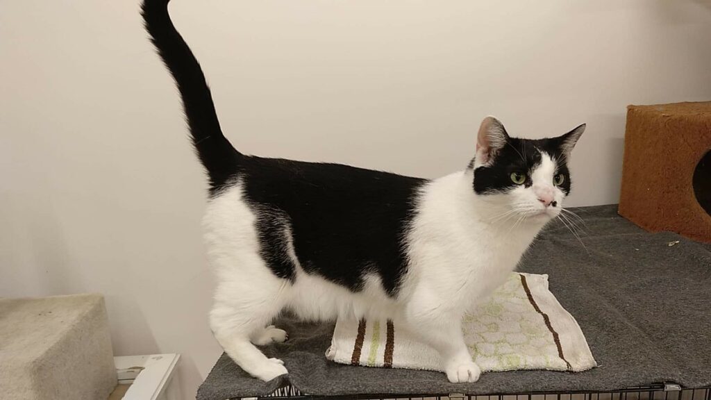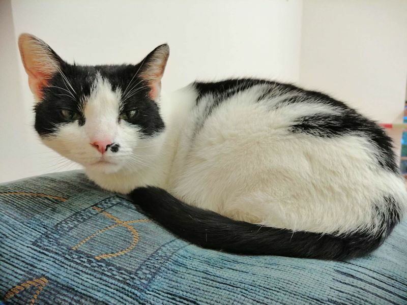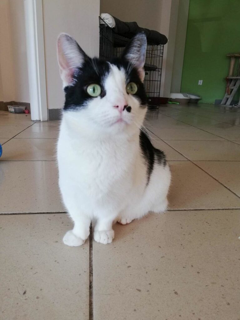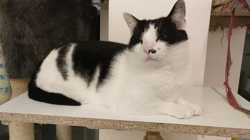 Niestety, jego opiekunka straciła mieszkanie, gdzie mogła mieszkać razem z kotem, a kocurek znów trafił do nas.