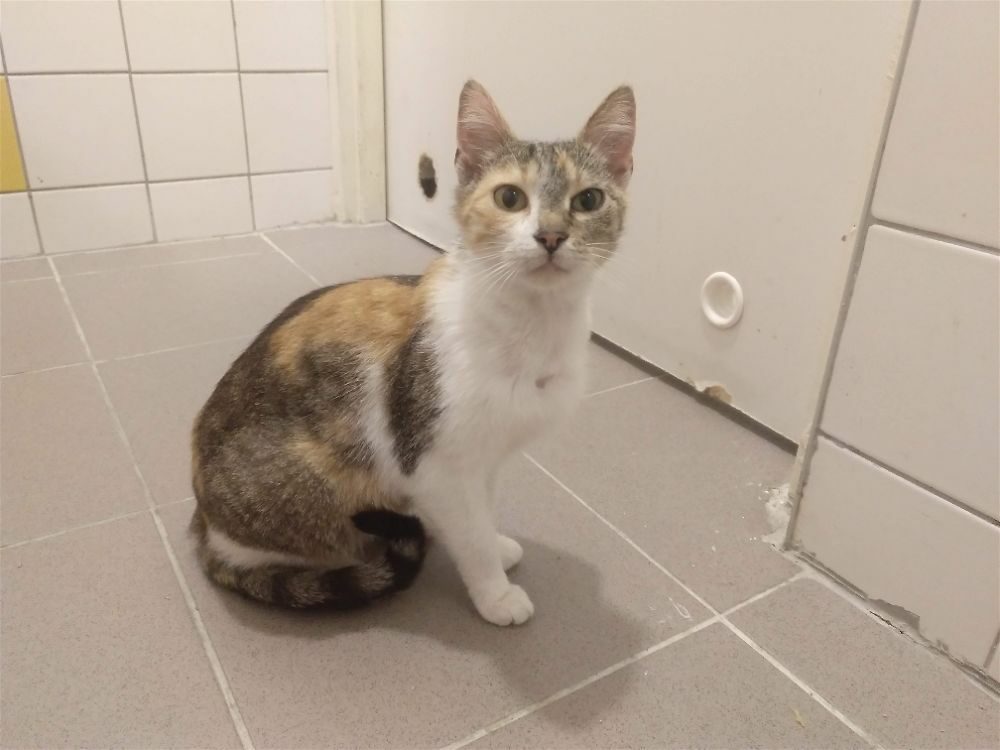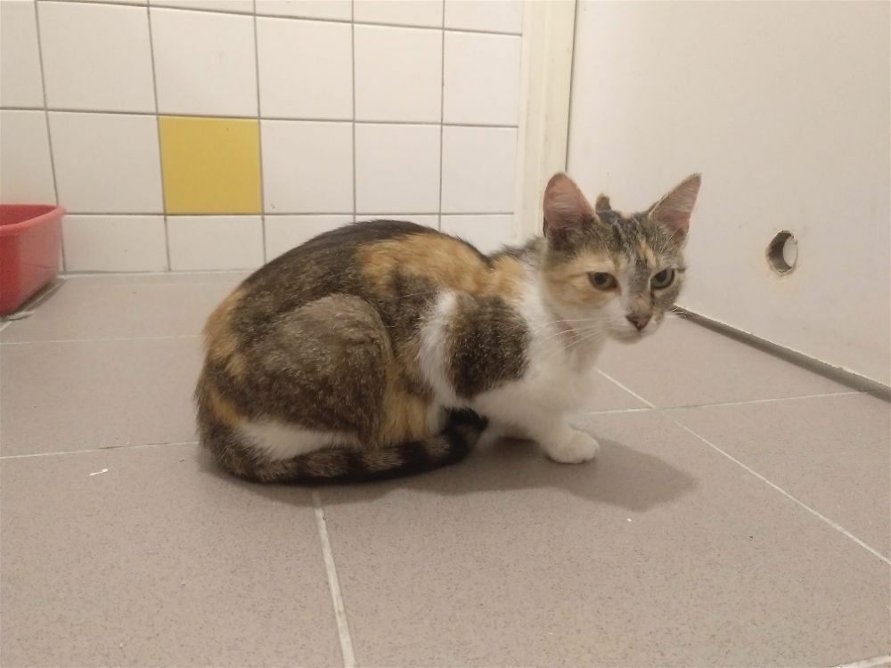 Kotka to skóra i kości, która ledwie trzyma się na łapkach. Jest to spowodowane niedożywieniem i długotrwałymi biegunkami, z którymi do nas przybyła. Nikt jej zapewne nie leczył, gdyż tam nie było takich możliwości.