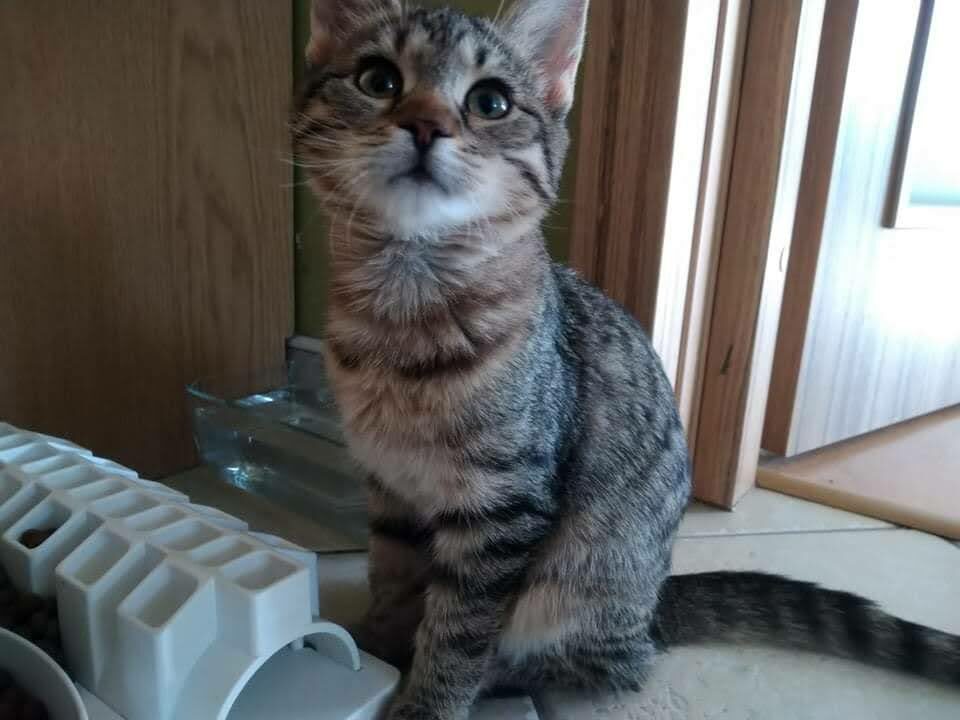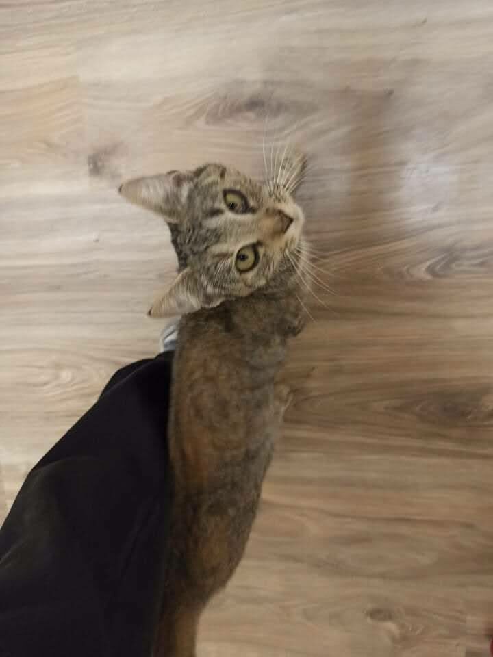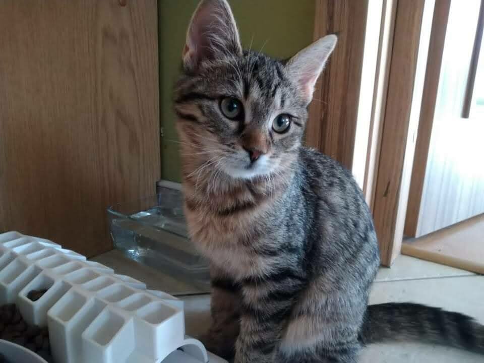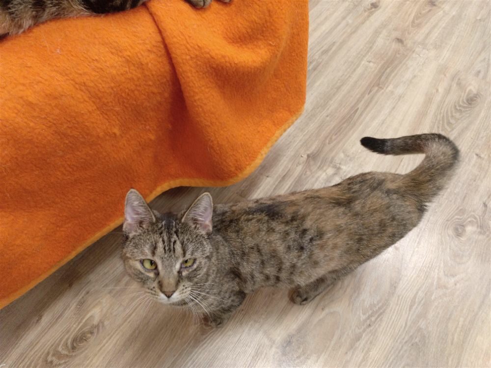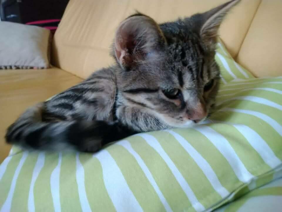 Morelka to kilkutygodniowe maleństwo, które jest u nas karmione buteleczką. Wymaga póki co intensywnej opieki, gdyż cierpi na biegunki . Niemniej jednak, humor jej dopisuje 🙂 Jest towarzyska, biegnie zawsze tam gdzie zamieszanie i lubi straszyć duże koty swoimi pokaźnymi rozmiarami 🙂