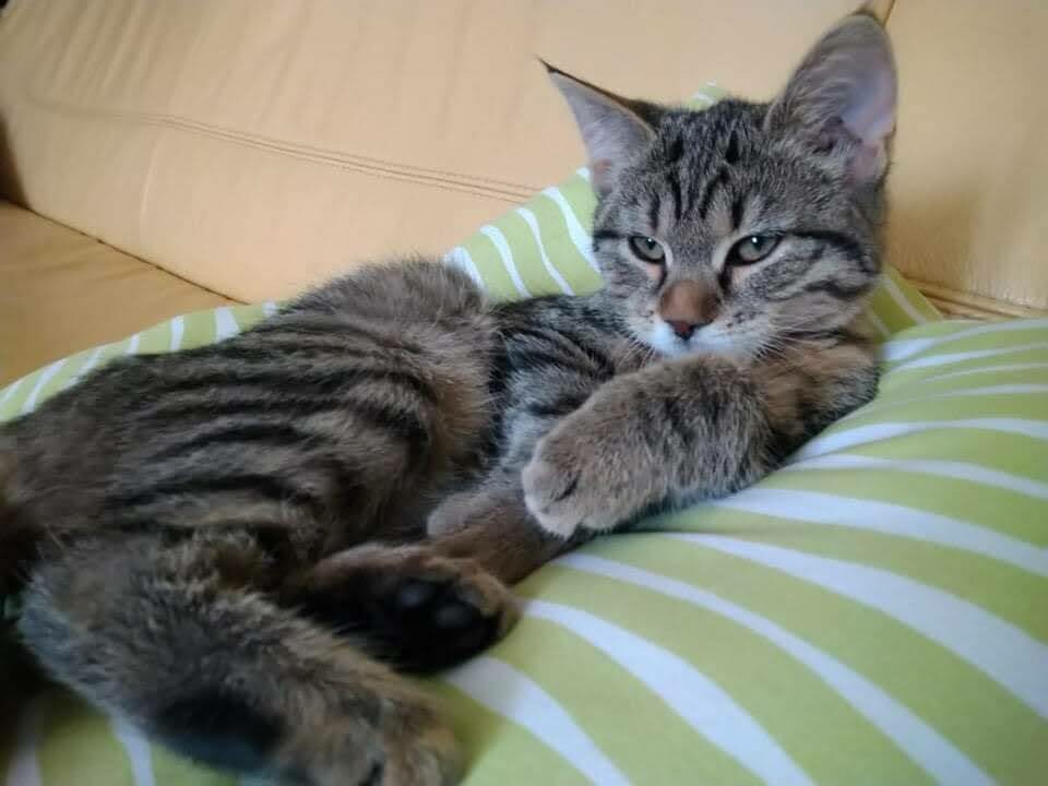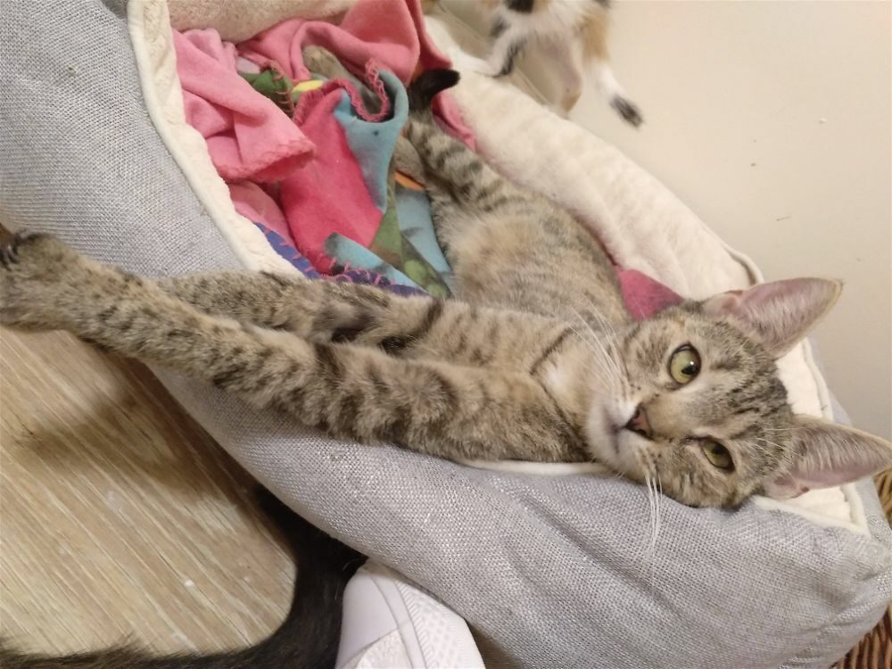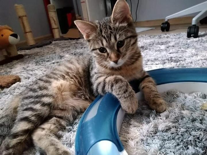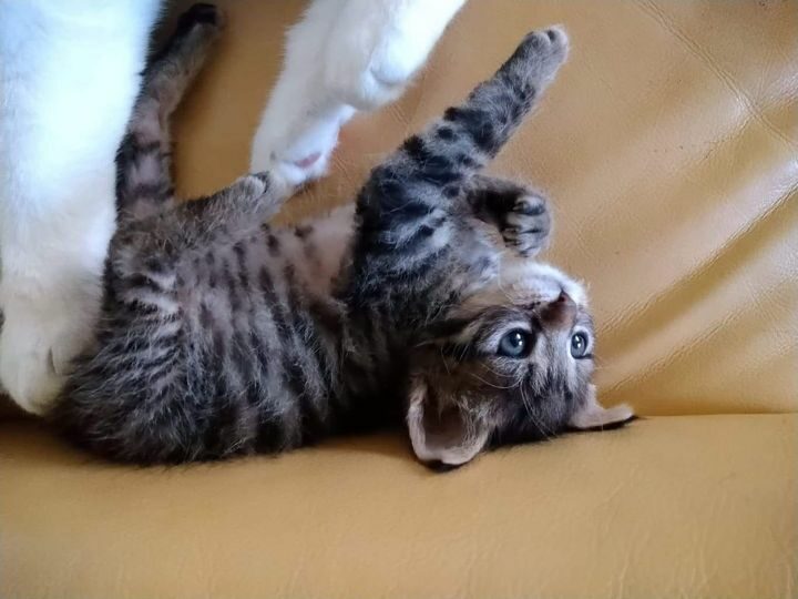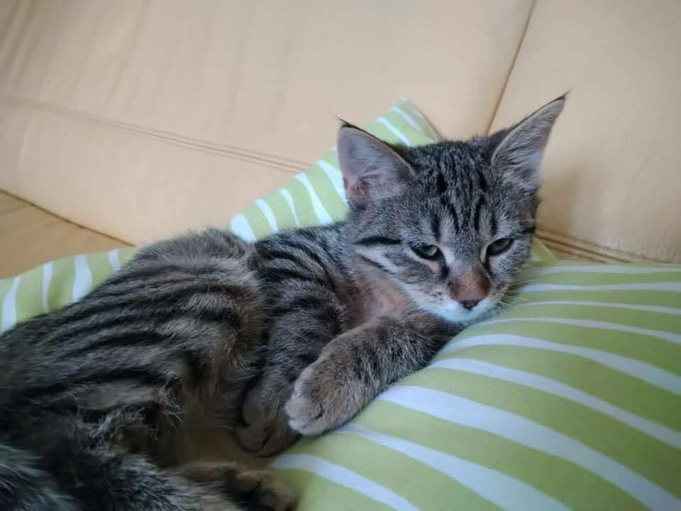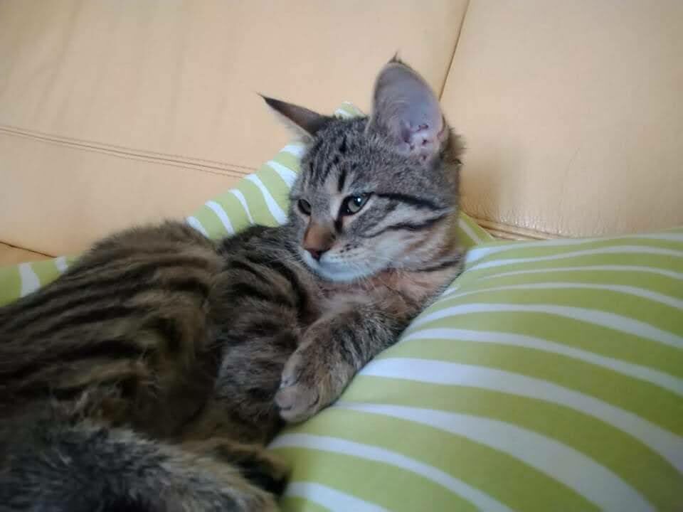 Morelka to kilkutygodniowe maleństwo, które jest u nas karmione buteleczką. Wymaga póki co intensywnej opieki, gdyż cierpi na biegunki . Niemniej jednak, humor jej dopisuje 🙂 Jest towarzyska, biegnie zawsze tam gdzie zamieszanie i lubi straszyć duże koty swoimi pokaźnymi rozmiarami 🙂