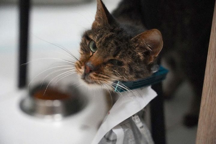 Wstępne wyniki badań kocurka nie są najlepsze. Konieczne jest leczenie i sanacja jamy ustnej. Ponadto, cierpi on na koci katar.