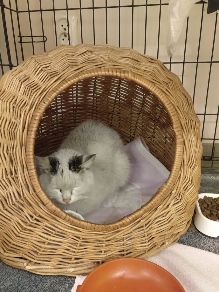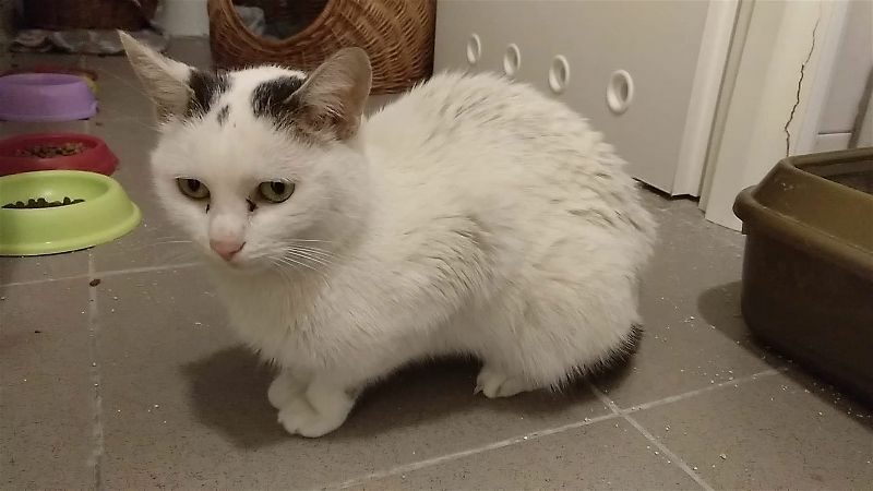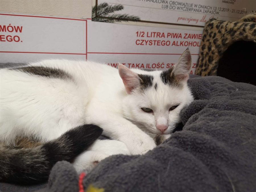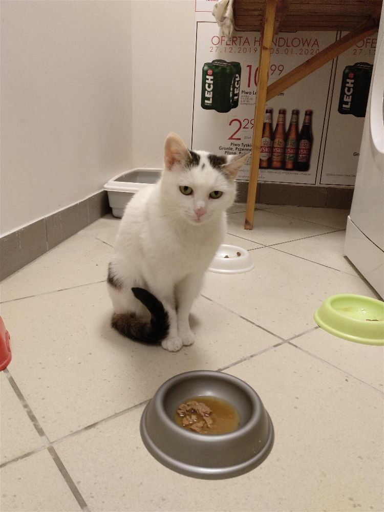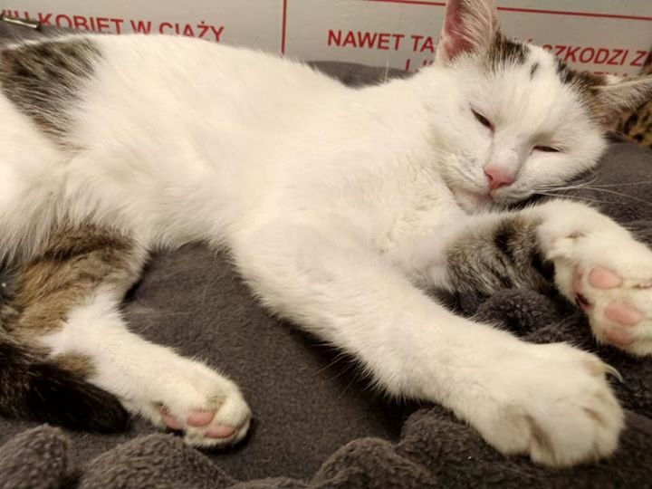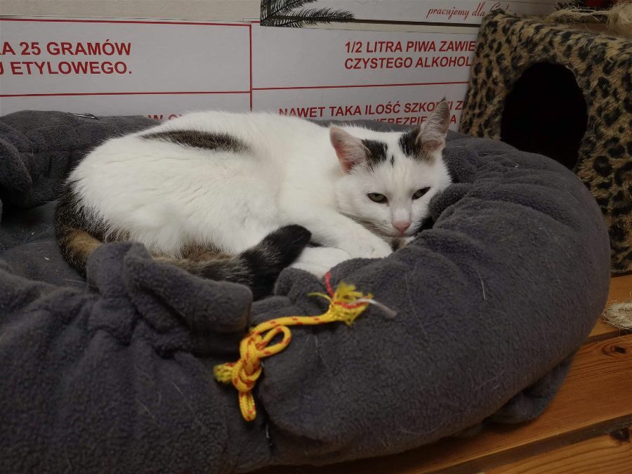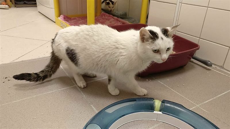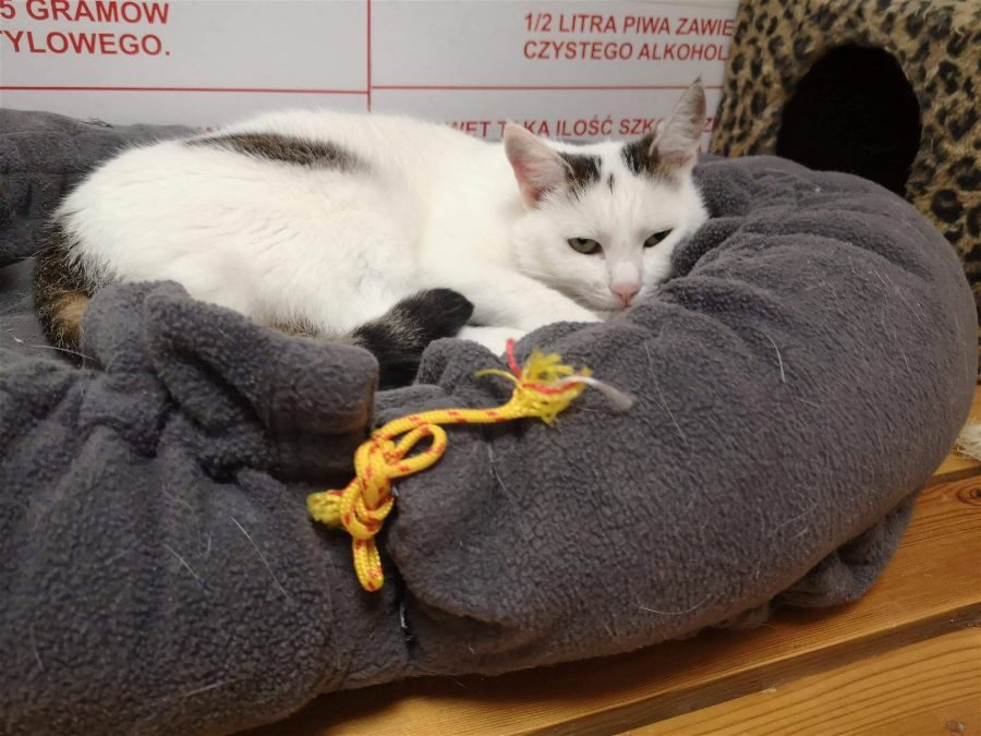 Kocurek był cały brudny, przeraźliwie chudy, a przez kilka dni po przyjęciu go do nas, wymiotował folią i innymi śmieciami, co wskazuje na to, że rozpaczliwie poszukiwał jedzenia.