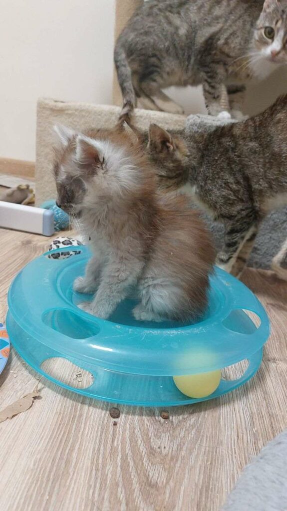 To małe kilku miesięczne cudo, kocha koty i człowieka. Wchodząc do pokoiku mówię pieszczotliwie: gdzie są moje Prosiaczki? Prosiaczek wtedy przybiega i „odzywa się” po kociemu, pokazując że jest i ewentualnie pakuje się na plecy, bądź opiera łapki o człowieka, żeby wziąć go na ręce i przytulać. Rozdaje buziaki, trąca noskiem i pakuje się na kolana. Wspaniały, rezolutny malec