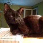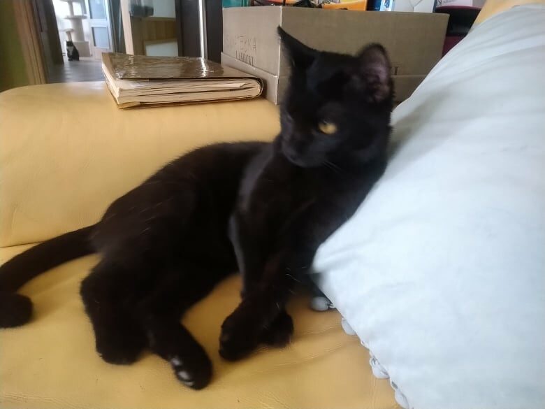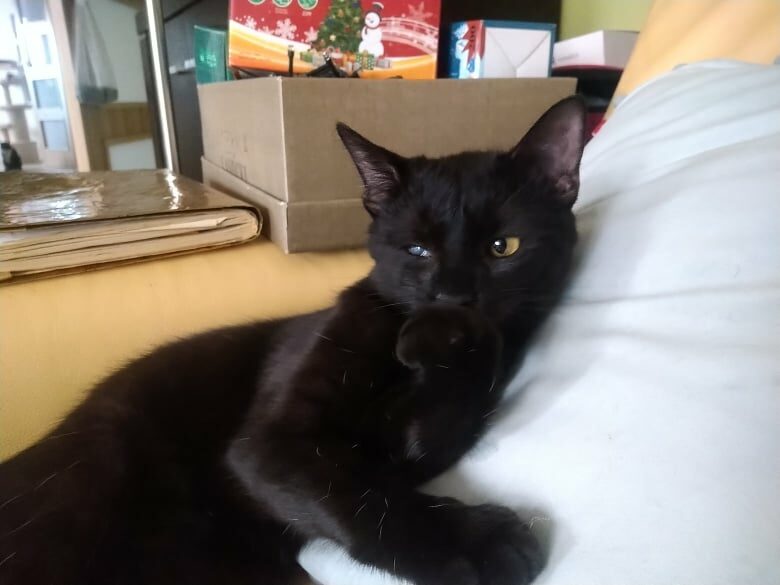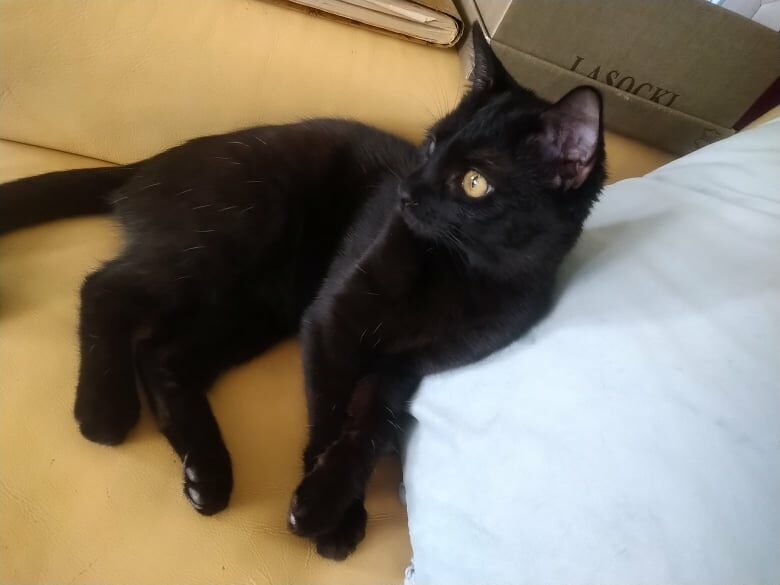 To jest Boluś. Jest po kocim katarze i jedno oczko jest trochę zamglone. Jest grzeczny i kocha ludzi i inne koty.