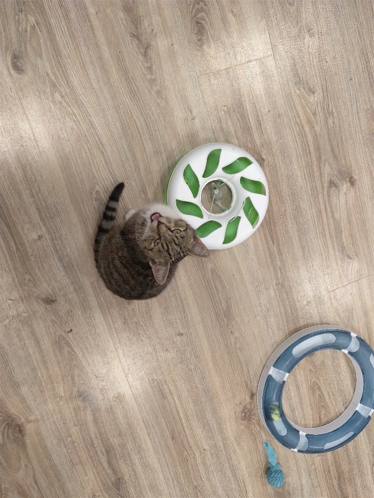 Kociak jest bardzo towarzyski, poza bieganiem za piłeczkami uwielbia pieszczoty. Chodzi za człowiekiem prosząc o więcej głasków.