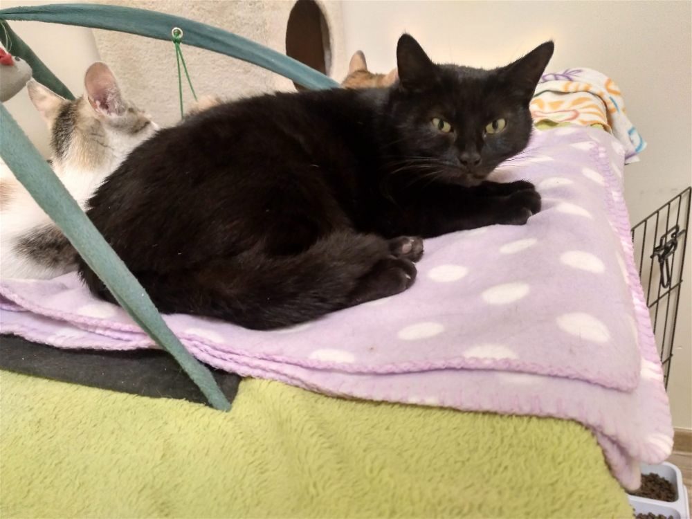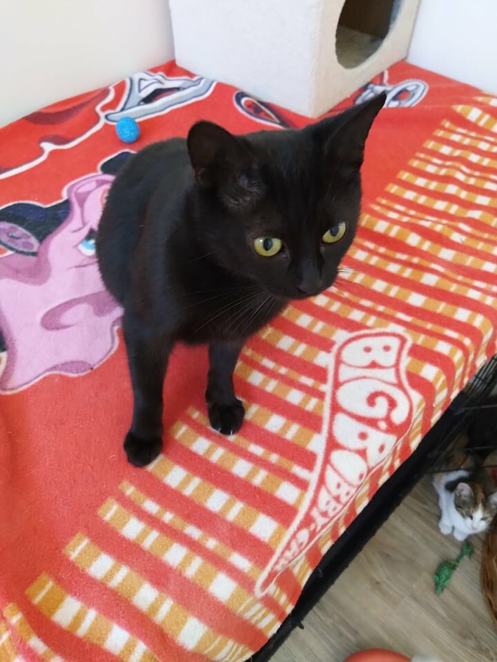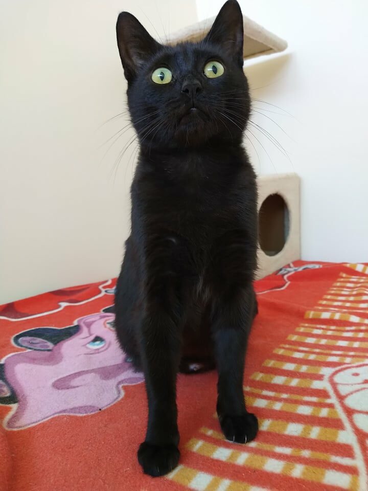 Ta kotka to wielkie serce w czarnym, kocim przebraniu. Uwielbia ludzi, pomiałkuje z radości kiedy do niej przychodzimy, patrzy na nas swoimi wielkimi zielonymi oczkami z nadzieją, że poświęcimy jej trochę czasu….kot ideał.