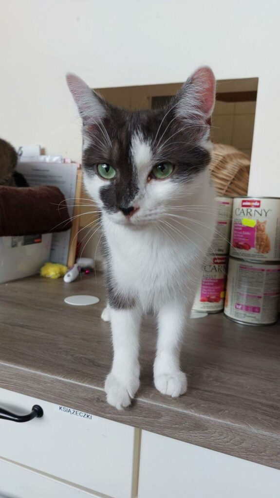 Zorro to zjawisko piękny, biało – popielaty kawaler o wspaniałym, radosnym i ciekawskim usposobieniu. Wszędzie go pełno i wszystko musi zobaczyć. Kocha zabawy wędką i surowe mięso, za którym potrafiłby doskoczyć naszego 3-metrowego sufitu 😹 Szuka domu niewychodzącego, najchętniej z drugim kotem 💕
