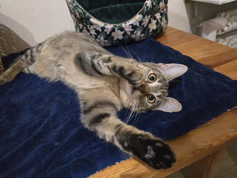 Jest bardzo grzecznym i, jak na swój wiek, spokojnym kocurkiem. Bardzo przymilnym do człowieka i świetnie dogadującym się z innymi kotami. Taki kot idealny 🌺 Gdybyśmy mieli 1000 takich kotów, na pewno dalibyśmy radę 😉