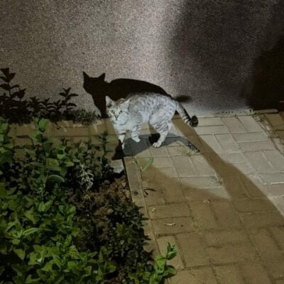 Kotek miałczy i nawołuje, ale ucieka przy próbie podejścia.