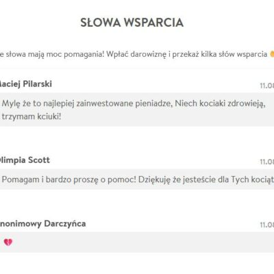 Przez ostatnie dni walczyliśmy o jego życie. Nie chcieliśmy jeszcze nic ogłaszać, ani organizować zbiórki, ponieważ wciąż sprawiał wrażenie jakby od nas odchodził. Maluch jest w domu tymczasowym w Tarnobrzegu, a my kursujemy tam codziennie, aby pomóc w opiece nad nim. Organizowaliśmy też nocny transport leków na padaczkę, gdyż ataki zaczęły się nagle i były ciągłe. Malutki koci organizm nie poradziłby sobie z takim napięciem.