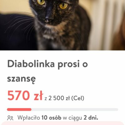 Zbiórka na Diabolinke stanęła w miejscu. Inne nasze chore koty chwilowo podzieliły się lekami, lecz niestety nie jesteśmy w stanie, póki co, zagwarantować jej całego leczenia 🥺 Odnosimy wrażenie że koteczka po kilku dawkach leku, czuje się odrobinkę lepiej, ale to przecież dopiero początek trzymiesięcznej kuracji 😭 W chwili obecnej na leczeniu fipowym mamy 12 innych kotów. Czy trzynastka będzie dla Diabolinki pechowa? 💔 Prosimy! Pomóżcie Diabolince 💔🙏 pomagam.pl/ehan8m Dane do przelewów: Fundacja Kocia Wyspa 26 1090 2750 0000 0001 2134 8540 (tytuł: Diabolinka) lub: PayPal: info@kociawyspa.org Możecie też stale wspierać nasze działania poprzez Patronite.