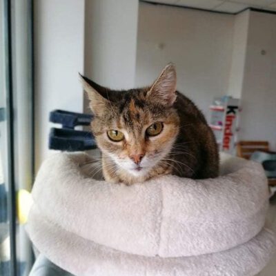 Jest spokojną i grzeczną koteczką, która bardzo docenia obecne warunki – opiekę wolontariuszy i pełną miseczkę.