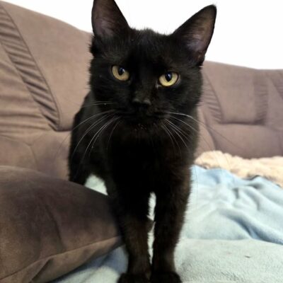 Kotka jest młoda i przyjazna. Ma długą czarną sierść, na dole przechodzącą w rudy odcień.