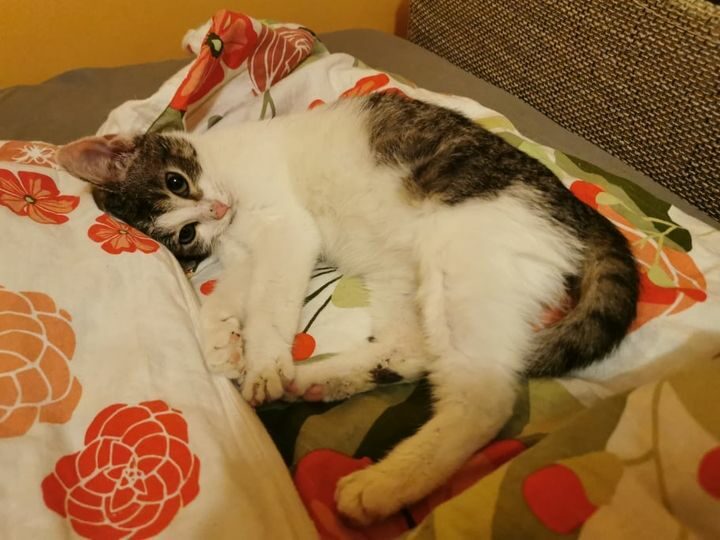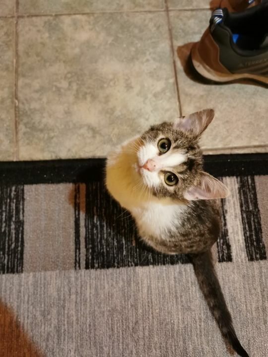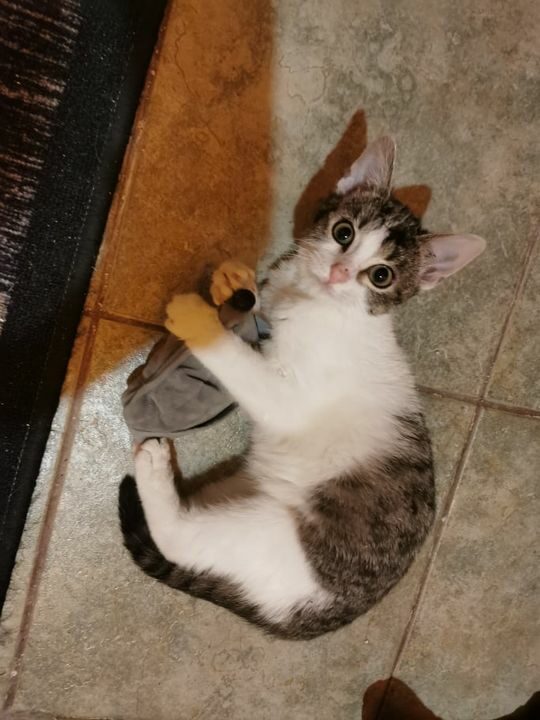 Miziasty maluszek, lubi dreptać za człowiekem, pakuje się na kolana i mruczy bardzo głośno. Koty toleruje.