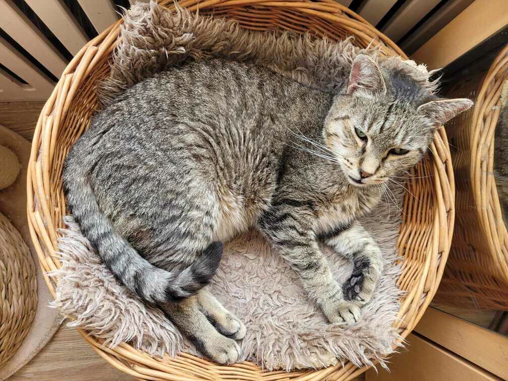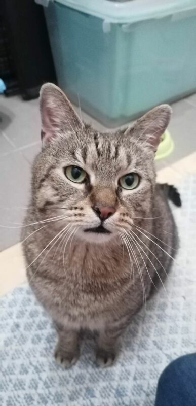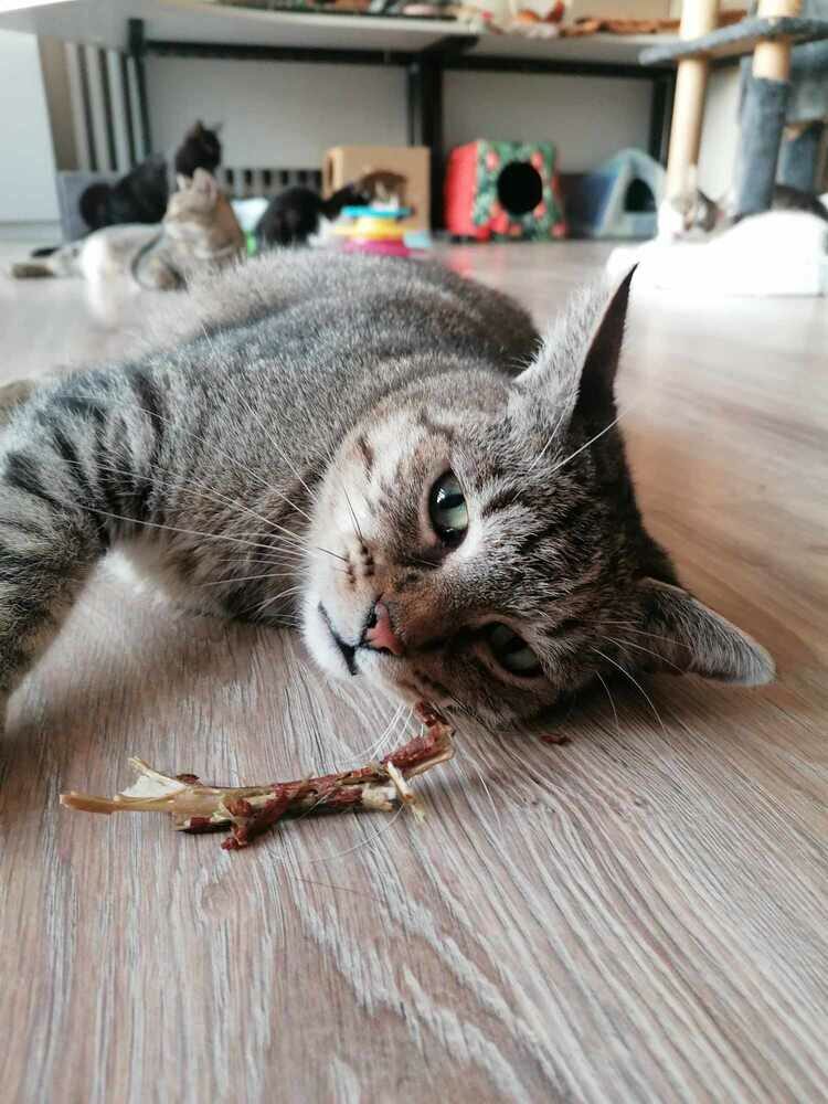 Po niespełna roku, jest już radosnym, zadowolonym kocim kawalerem. Problemy socjalizacyjne oczywiście wystąpiły i nadal obserwujemy u niego przebodźcowanie i nerwowość, ale pamiętając o 3 latach jego niewoli, dajemy mu przestrzeń i wyrozumiałość.
