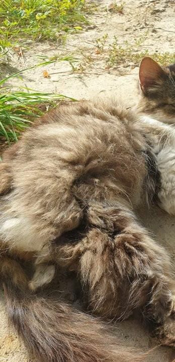 Ta puchata kulka, na pierwszy rzut oka wydawała się zdrowa i w świetnej kondycji. Jej grube futerko skrywało jednak istny dramat… począwszy od złogów zaschniętych odchodów i odparzeń na skórze w okolicach ogonka, poprzez jeden wielki kołtun na całym ciele, całe rodziny kleszczy o takich rozmiarach, jakich nie widzieliśmy do tej pory, aż po stan zapalny skóry. Kotka po ogoleniu i kąpieli w specjalnym szamponie, okazała się wręcz zagłodzona