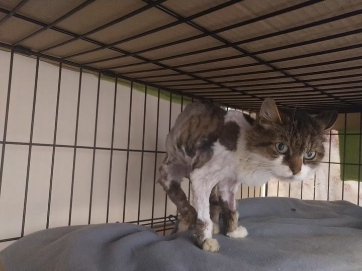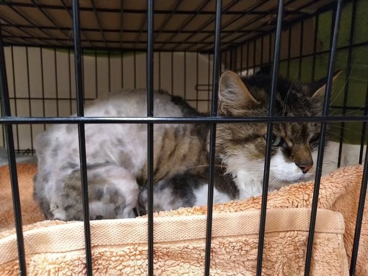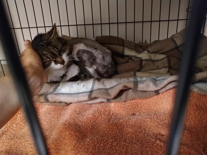 Obecnie dochodzi do siebie w klatce, ale inne koty bardzo ją stresują.