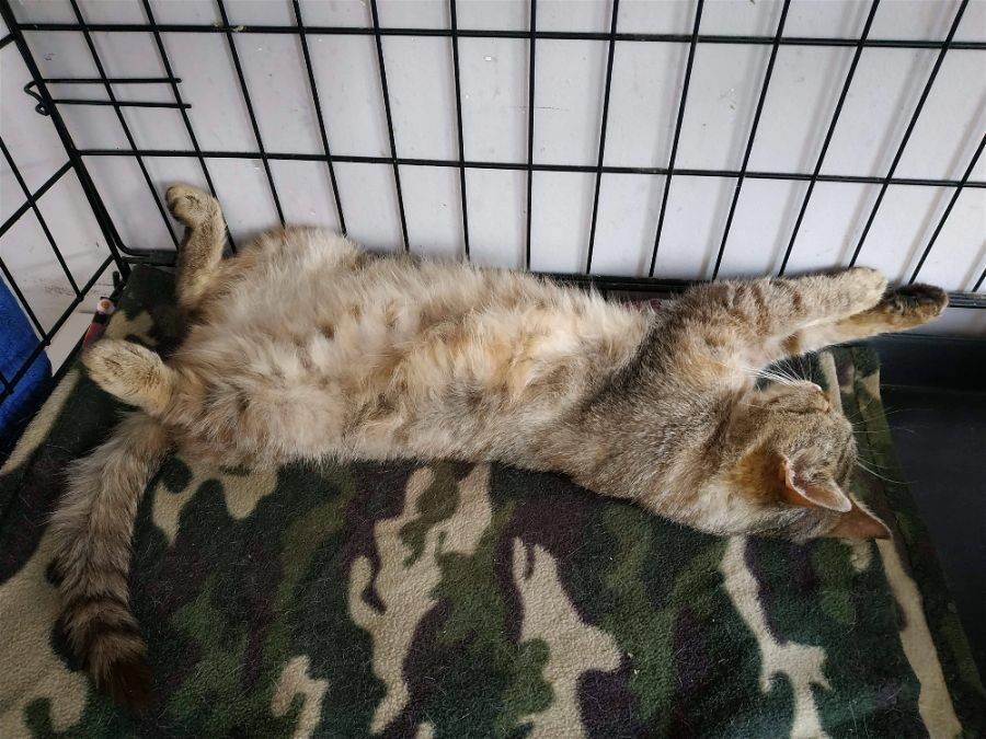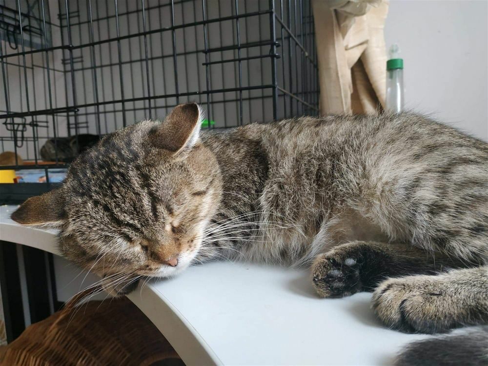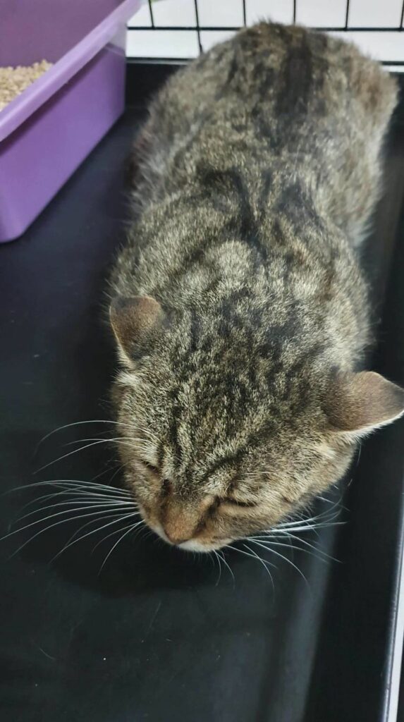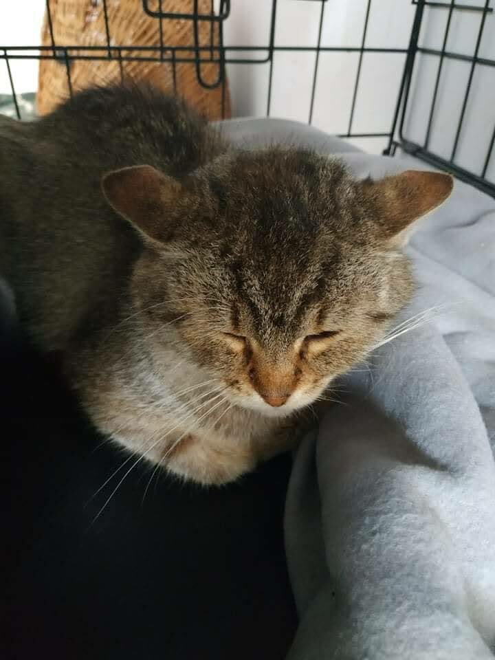 Faktycznie – w lesie siedział grubiutki burasek… ani nie uciekał, ani też nie dał do siebie podejść. Wyglądał, jakby bardzo chciało mu się spać, co mogło być wynikiem ogromnego zmęczenia. Porzucone koty, zwykle przez wiele dni nie śpią i kiedy trafiają do nas, długo odsypiają włóczęgę.