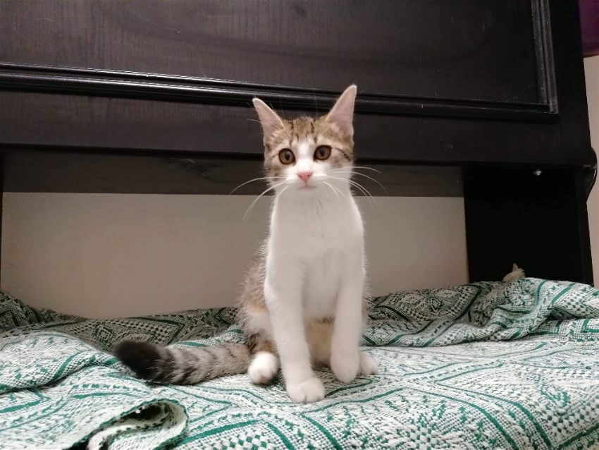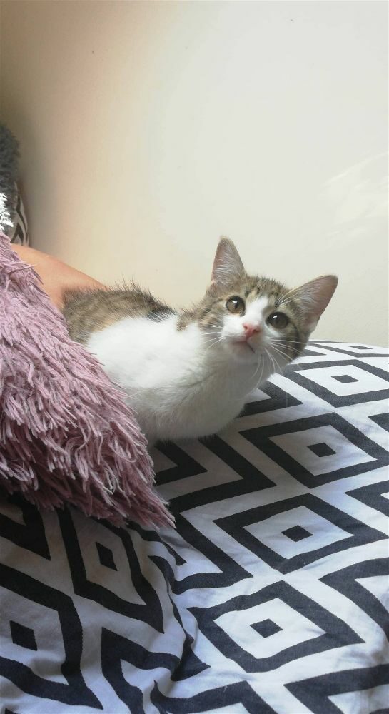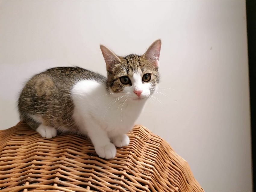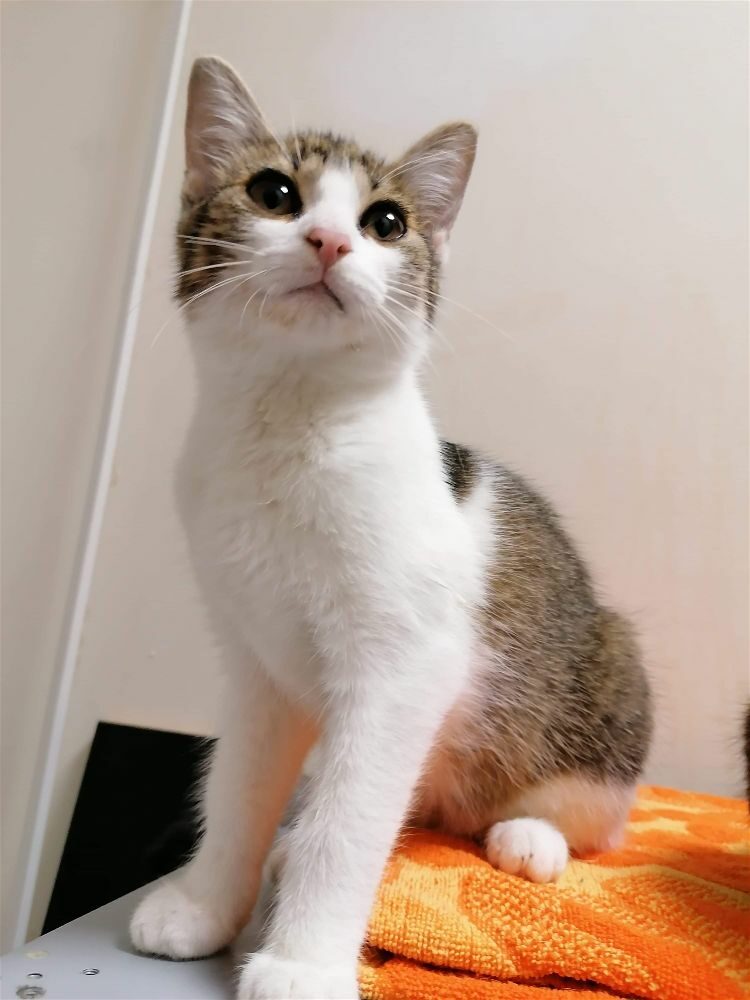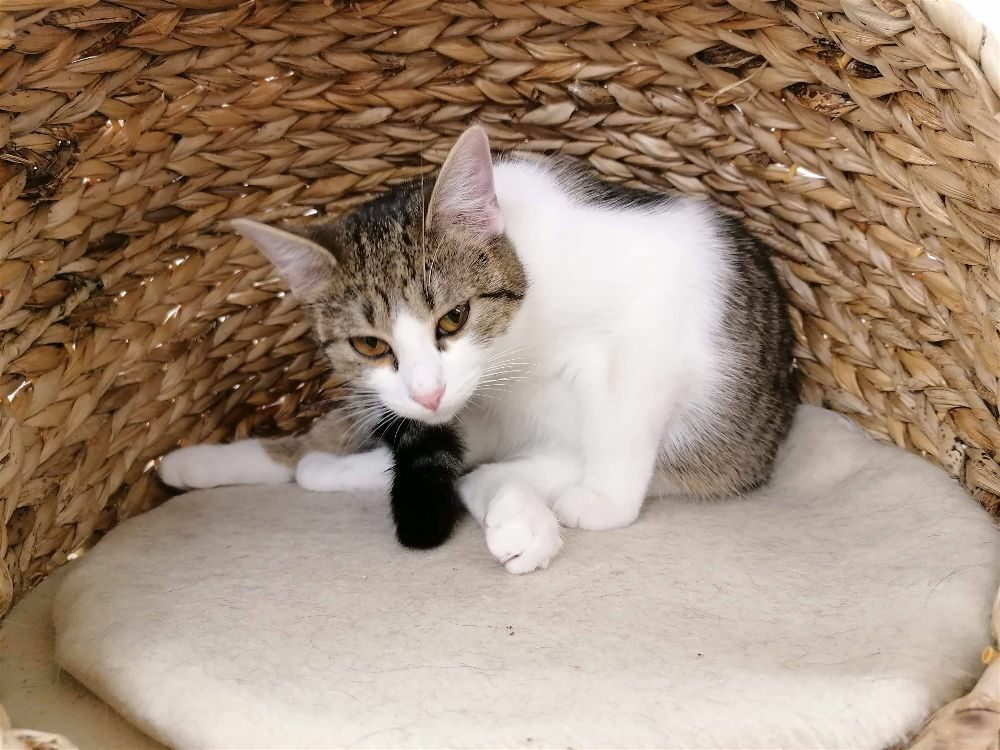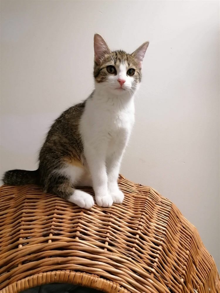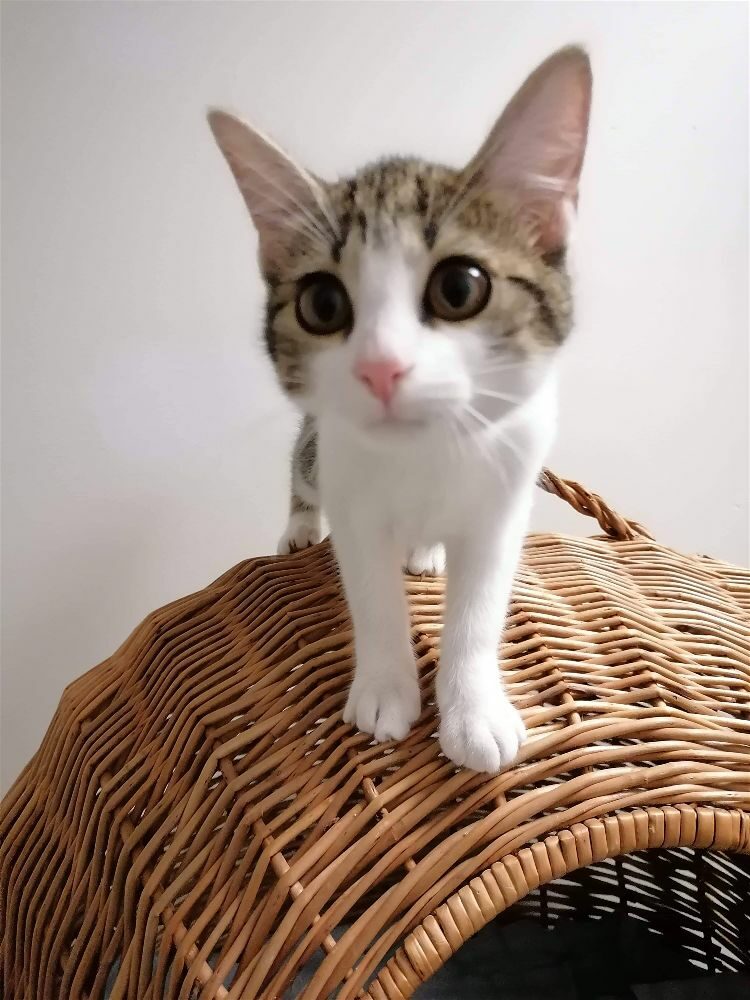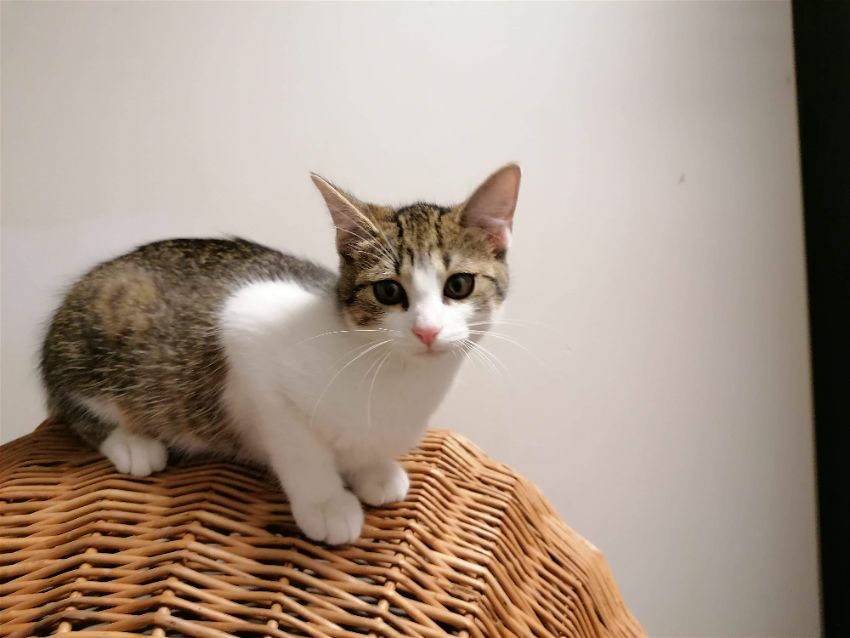 Kotka jest strasznie ciekawska, wszędzie jej pełno, szybko łapie kontakt z ludźmi i pcha się na kolana, wskakuje na plecy i miauczy o uwagę. Uwielbia głaskanie i przytulanie równie mocno co zabawy, ganianie za piłkami czy wędkami. Na inne koty reaguje warczeniem i syczeniem. Za to jest związana ze swoim braciszkiem, dlatego wspólnie czekają na dom. Do oddania w dwupaku ze Zgredkiem.