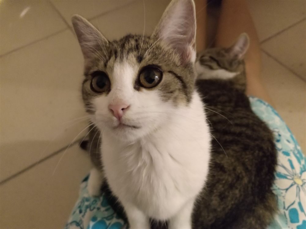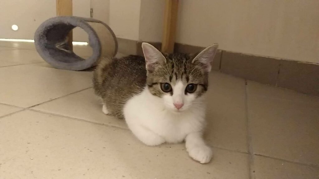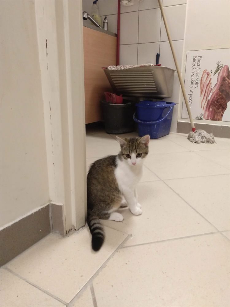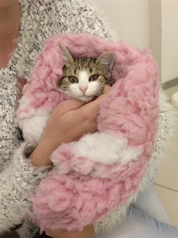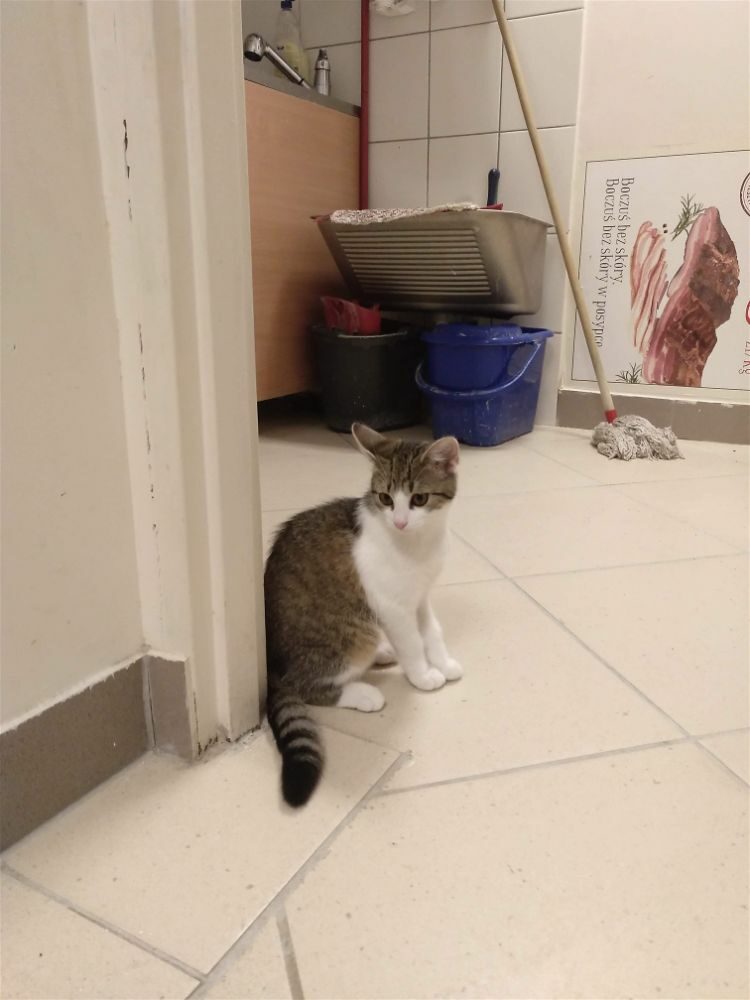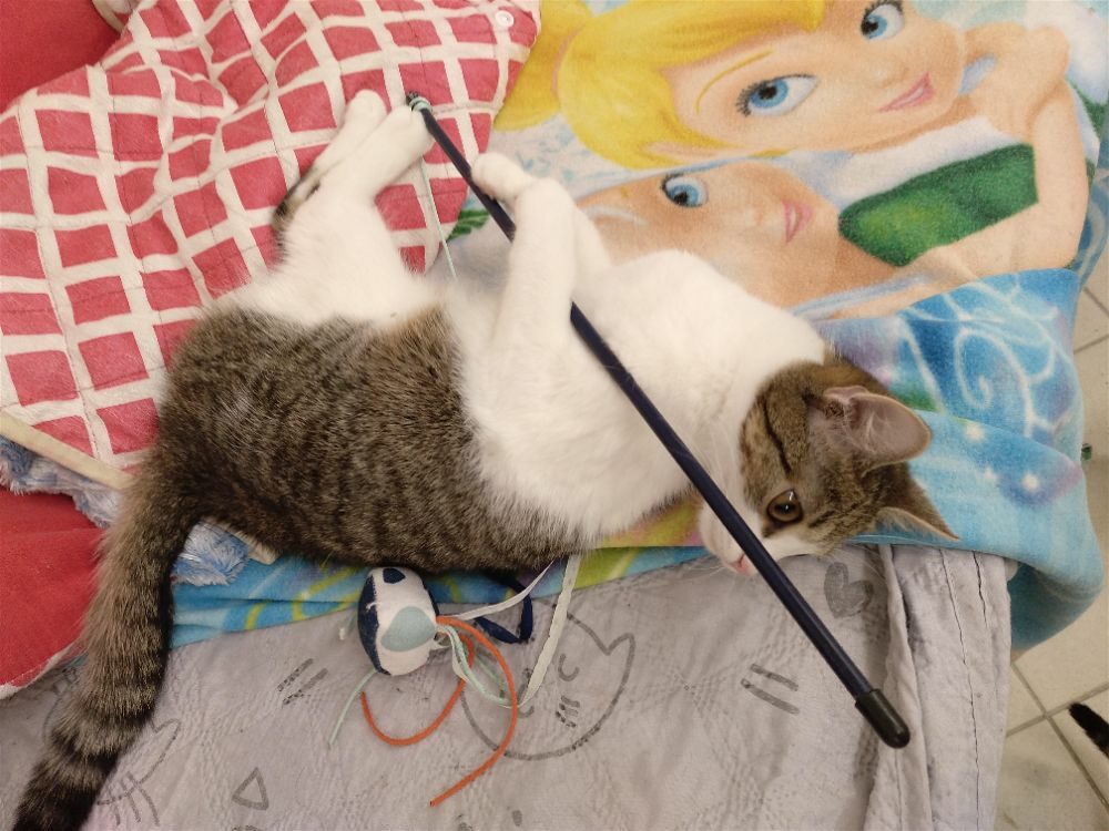 Kotka jest strasznie ciekawska, wszędzie jej pełno, szybko łapie kontakt z ludźmi i pcha się na kolana, wskakuje na plecy i miauczy o uwagę. Uwielbia głaskanie i przytulanie równie mocno co zabawy, ganianie za piłkami czy wędkami. Na inne koty reaguje warczeniem i syczeniem. Za to jest związana ze swoim braciszkiem, dlatego wspólnie czekają na dom. Do oddania w dwupaku ze Zgredkiem.