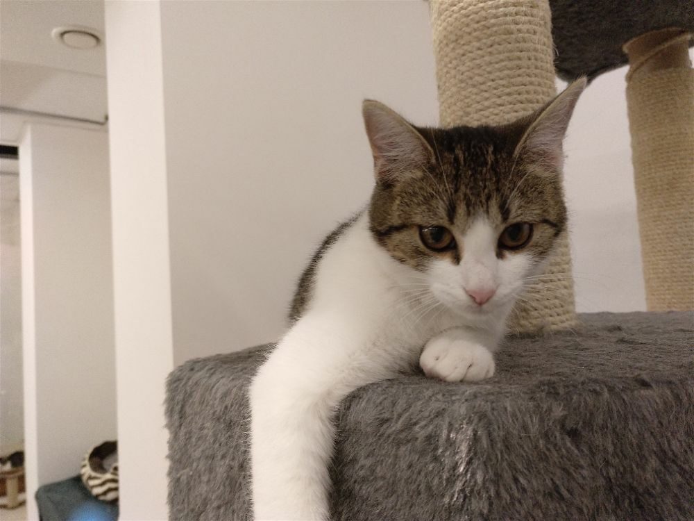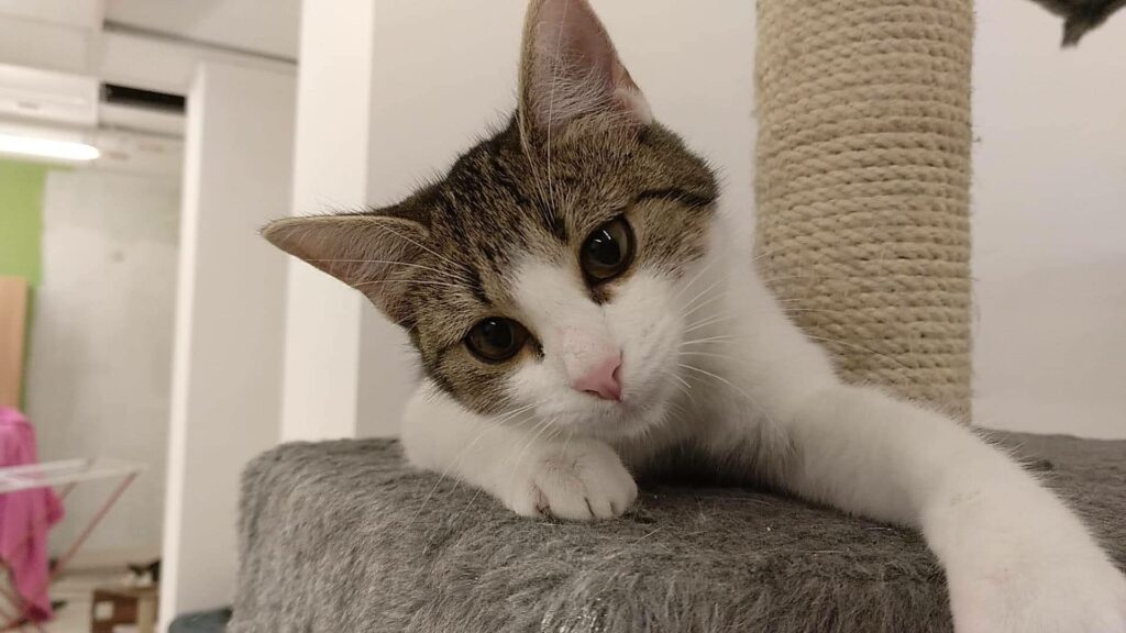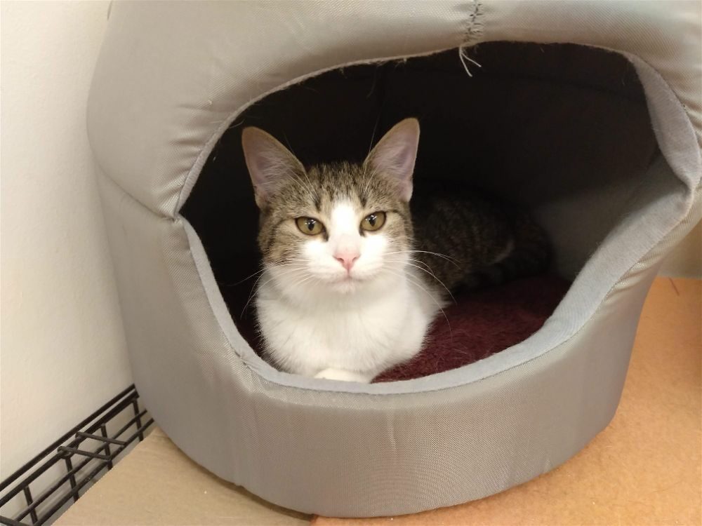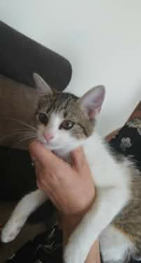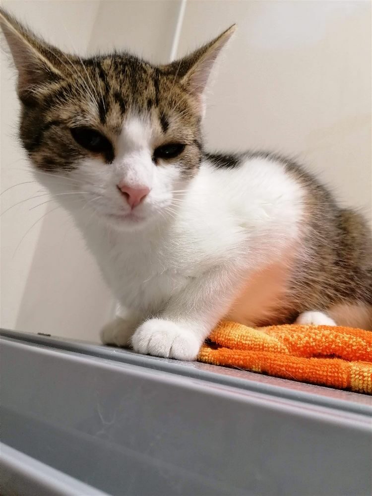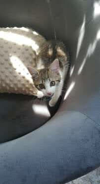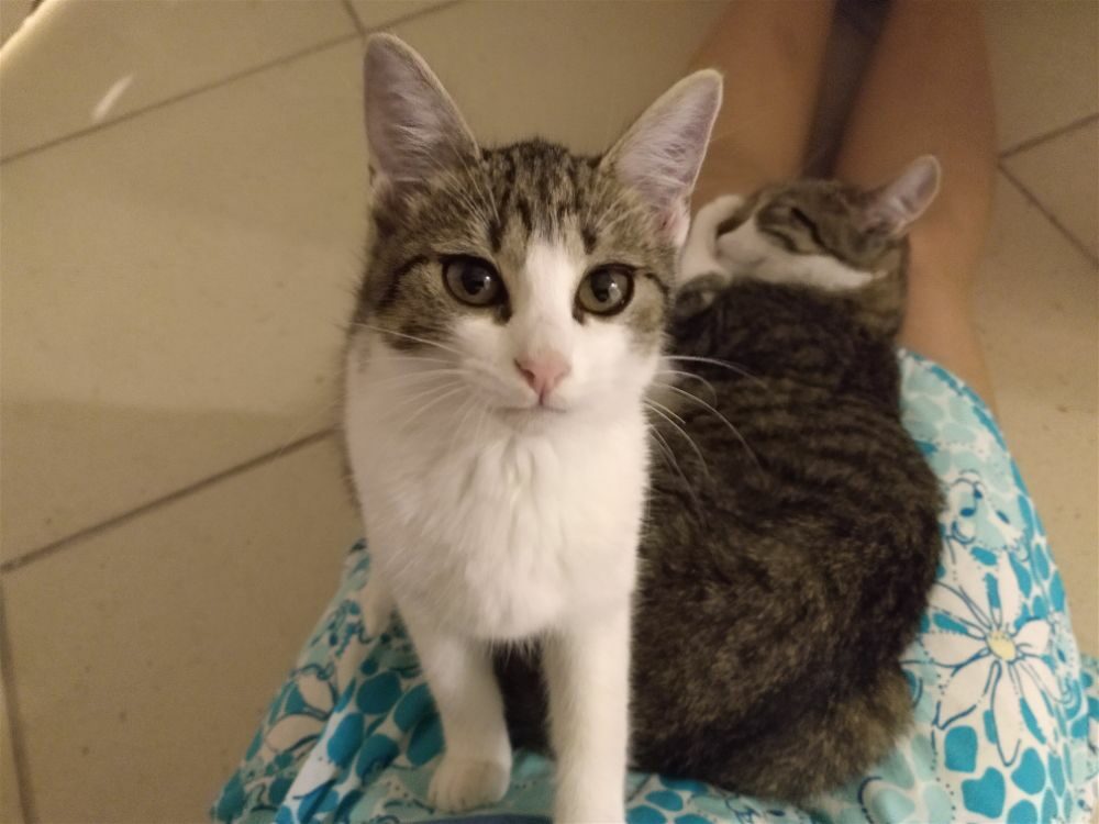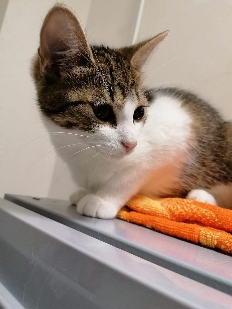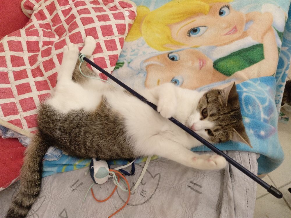 Kotka jest strasznie ciekawska, wszędzie jej pełno, szybko łapie kontakt z ludźmi i pcha się na kolana, wskakuje na plecy i miauczy o uwagę. Uwielbia głaskanie i przytulanie równie mocno co zabawy, ganianie za piłkami czy wędkami. Na inne koty reaguje warczeniem i syczeniem. Za to jest związana ze swoim braciszkiem, dlatego wspólnie czekają na dom. Do oddania w dwupaku ze Zgredkiem.