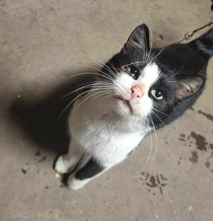 Zmarznięty młody kocurek, próbował dostać się do sklepu w Zbydniowie, w poszukiwaniu ciepła.