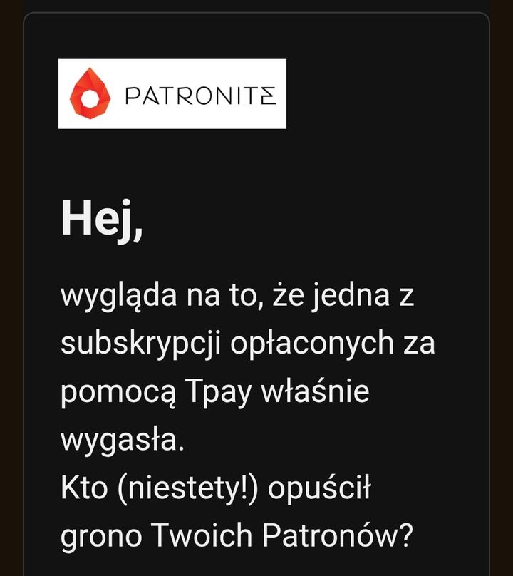 Kochani! Wiele subskrypcji na Patronite właśnie wygasła. Wygasają one automatycznie i czasami możecie nie mieć świadomości że już nie należycie do grona Patronów.