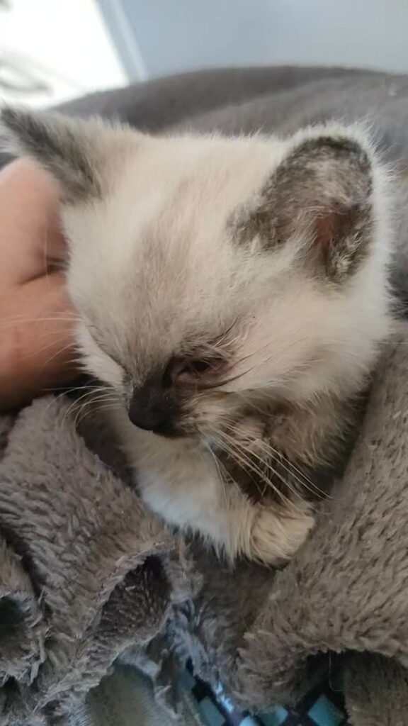 Kociak przyjęty wczoraj pod naszą opiekę jest bardzo słabiutki, ale mamy wrażenie, że jest odrobinę lepiej niż wczoraj.