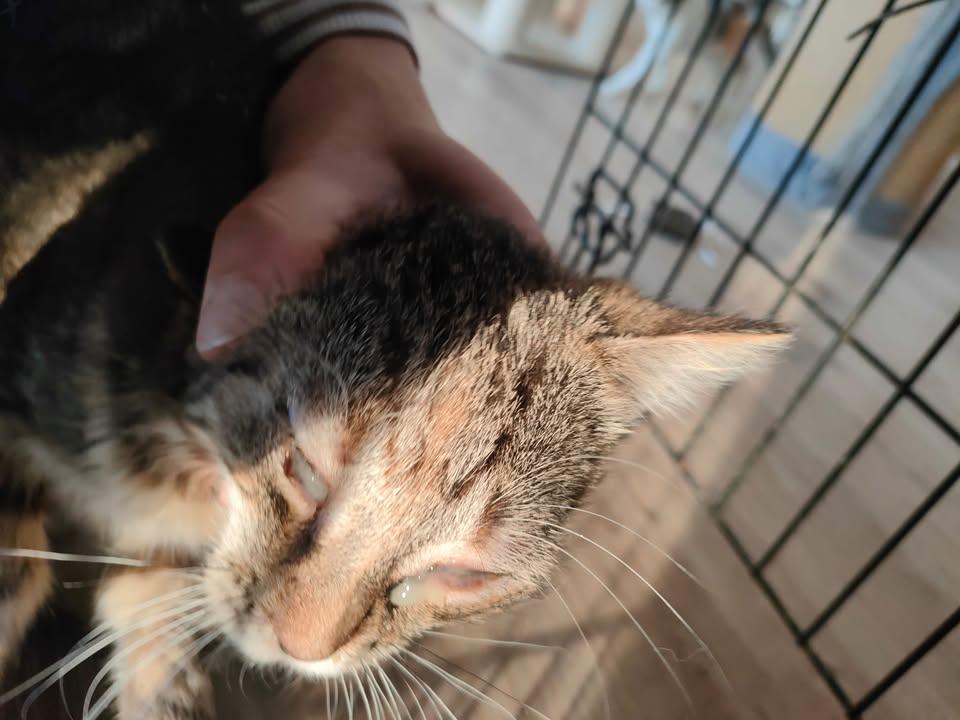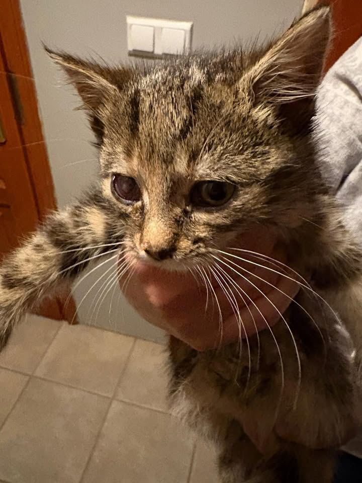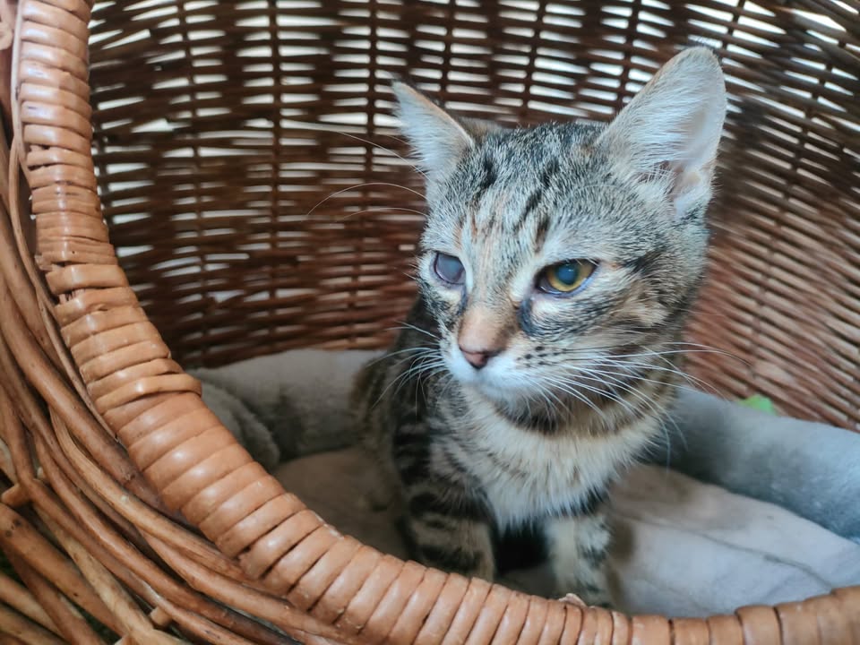 Razem z rodzeństwem trafiła do domu tymczasowego, lecz jej czas się skończył i musiała do nas wrócić. Niestety, zmiana miejsca i związanych z tym bakterii i wirusów w otoczeniu,spowodowały ogromną infekcję oczu, która nie wiadomo jak się skończy 🙁
