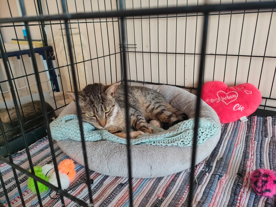 Jest nieśmiałym kocurkiem…zwykle się chowa i unika zamieszania. Może dlatego, w tej grupie ponad 100 kotów, objawy FIPa dostrzegliśmy, kiedy już jest bardzo bardzo źle.