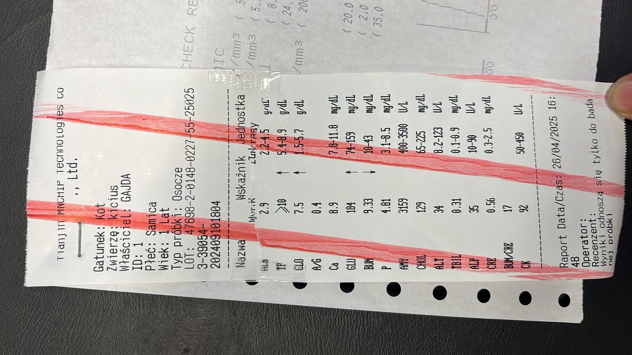 Na miejscu zastaliśmy kotkę w stanie skrajnego wyniszczenia, z objawami neurologicznymi (tiki nerwowe) i zmianami w oczach (anizokoria, krwiaki w jednym oku). Kotka jest jeszcze młodziutka, ale widać po niej, że jest zdecydowanie za chuda. Choruje od kilku tygodni. Objawy neurologiczne pojawiły się wczoraj.